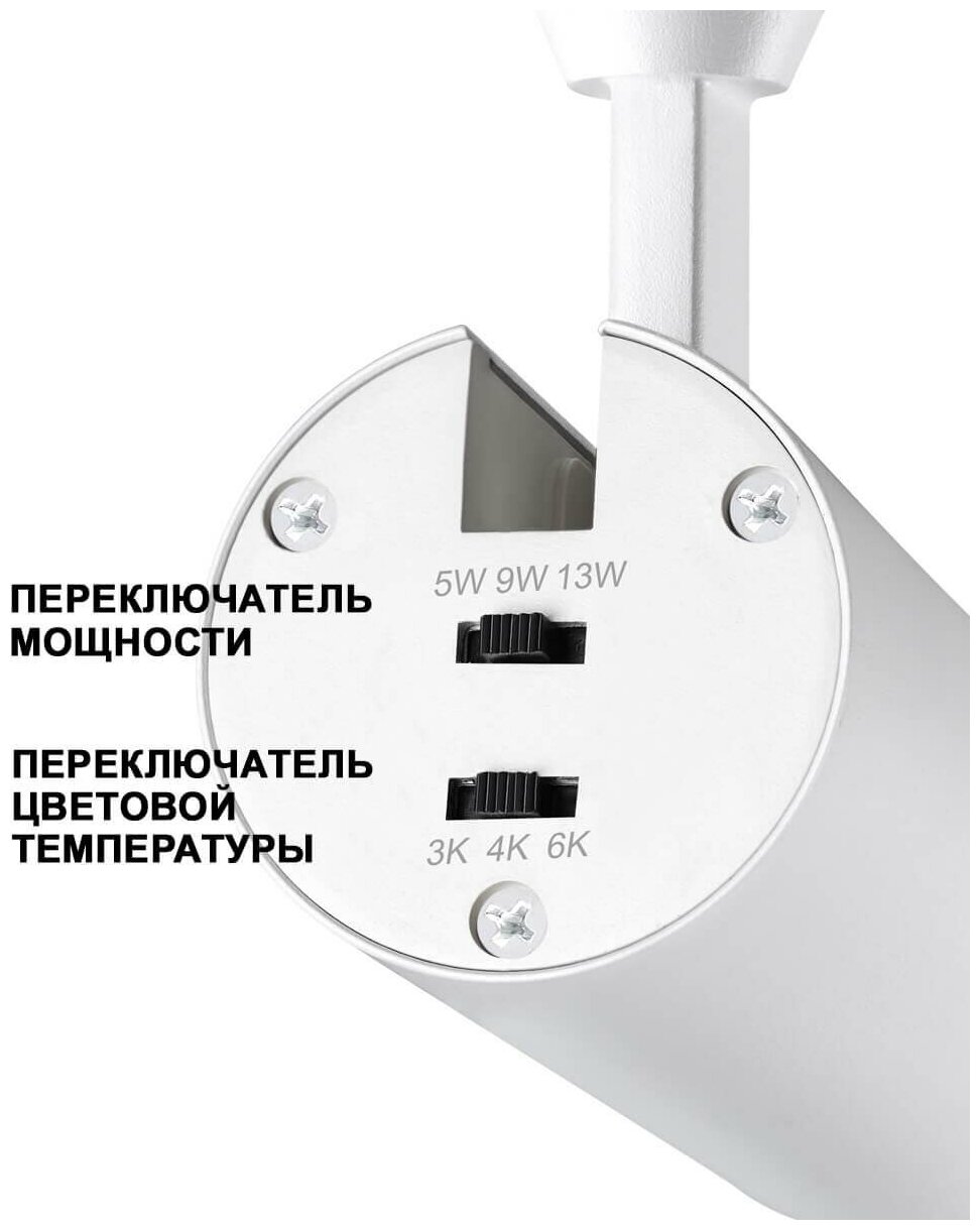 Трехфазный белый 359030 трековый светильник с переключателем цветовой температуры и мощности IP20 LED 3000К\4000К\6000К 5W/9W/13W 220V N