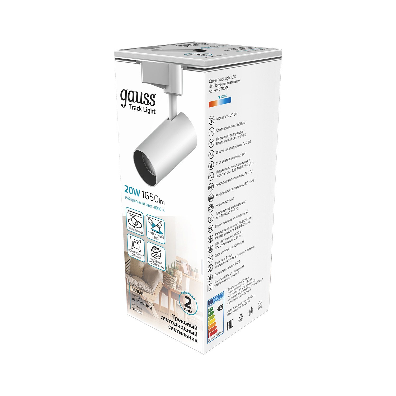 Трековый светильник-спот gauss TR081, 4000 К, белый