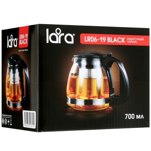Чайник заварочный стеклянный LARA LR06-19 Black/ 0.7 л/ стальной фильтр/ подъем крышки