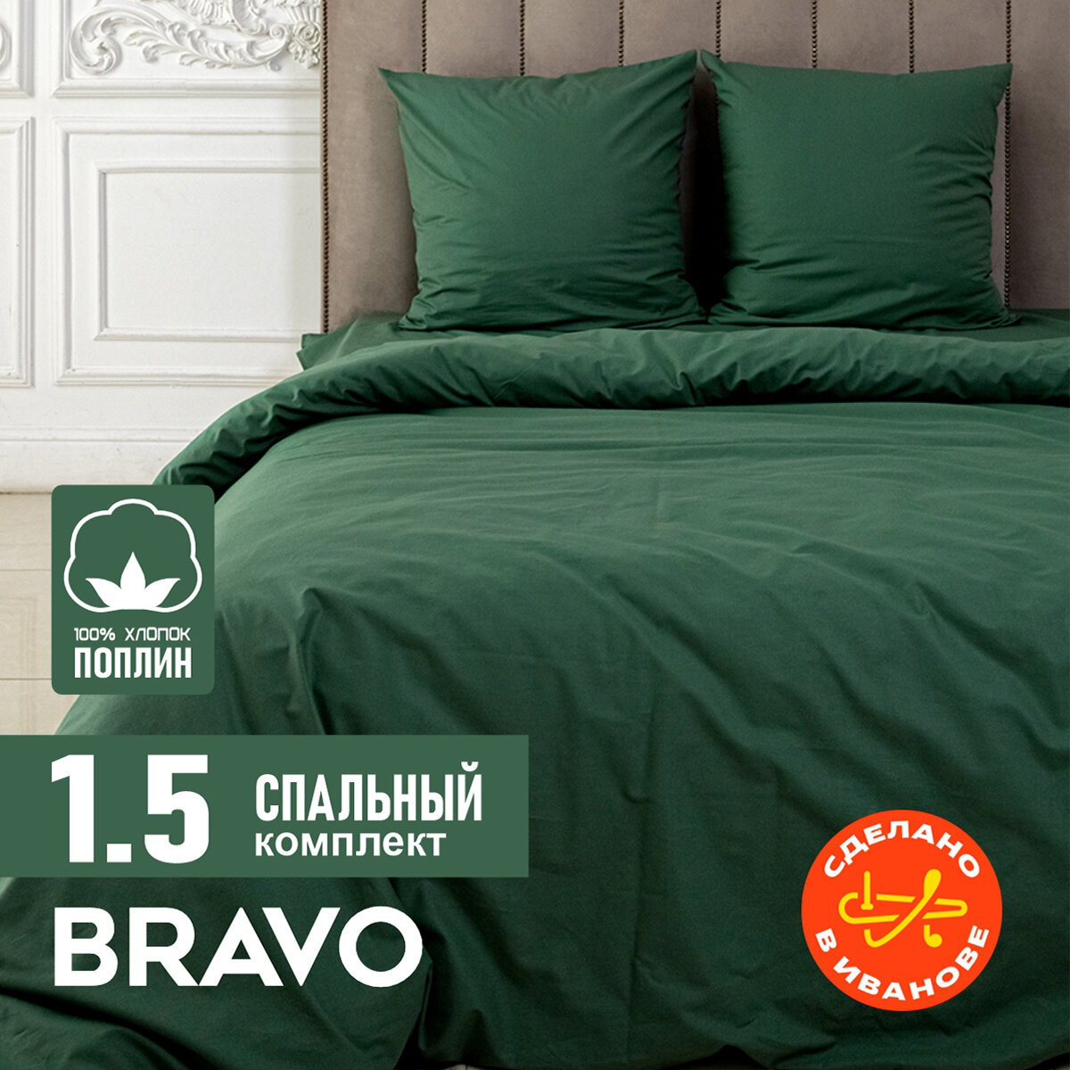 Постельное белье 1,5 спальный размер BRAVO поплин изумруд/ хлопок / наволочки 70х70