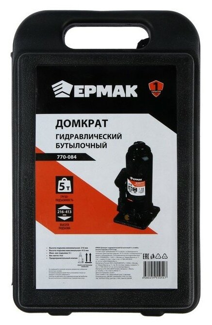 Ермак Домкрат гидравлический бутылочный ермак, 770-084, высота подъема 216-413 мм, 5 т
