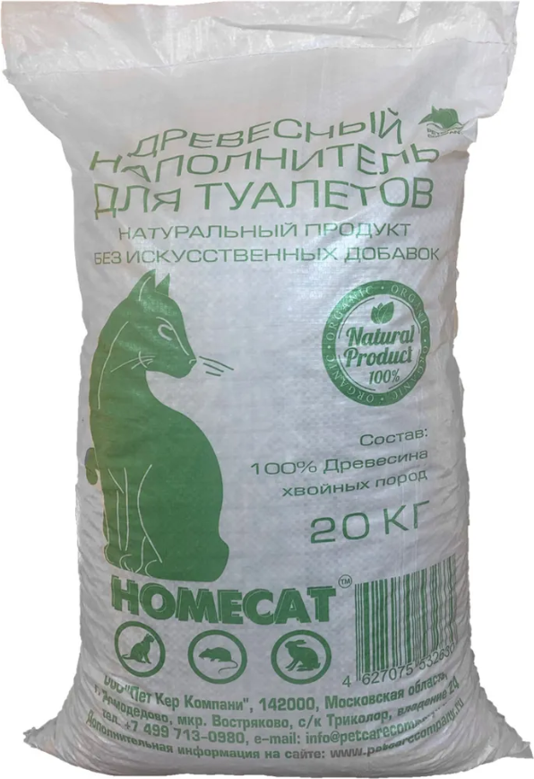 Древесный наполнитель Хоумкэт для кошачьего туалета Мелкие гранулы 20 кг