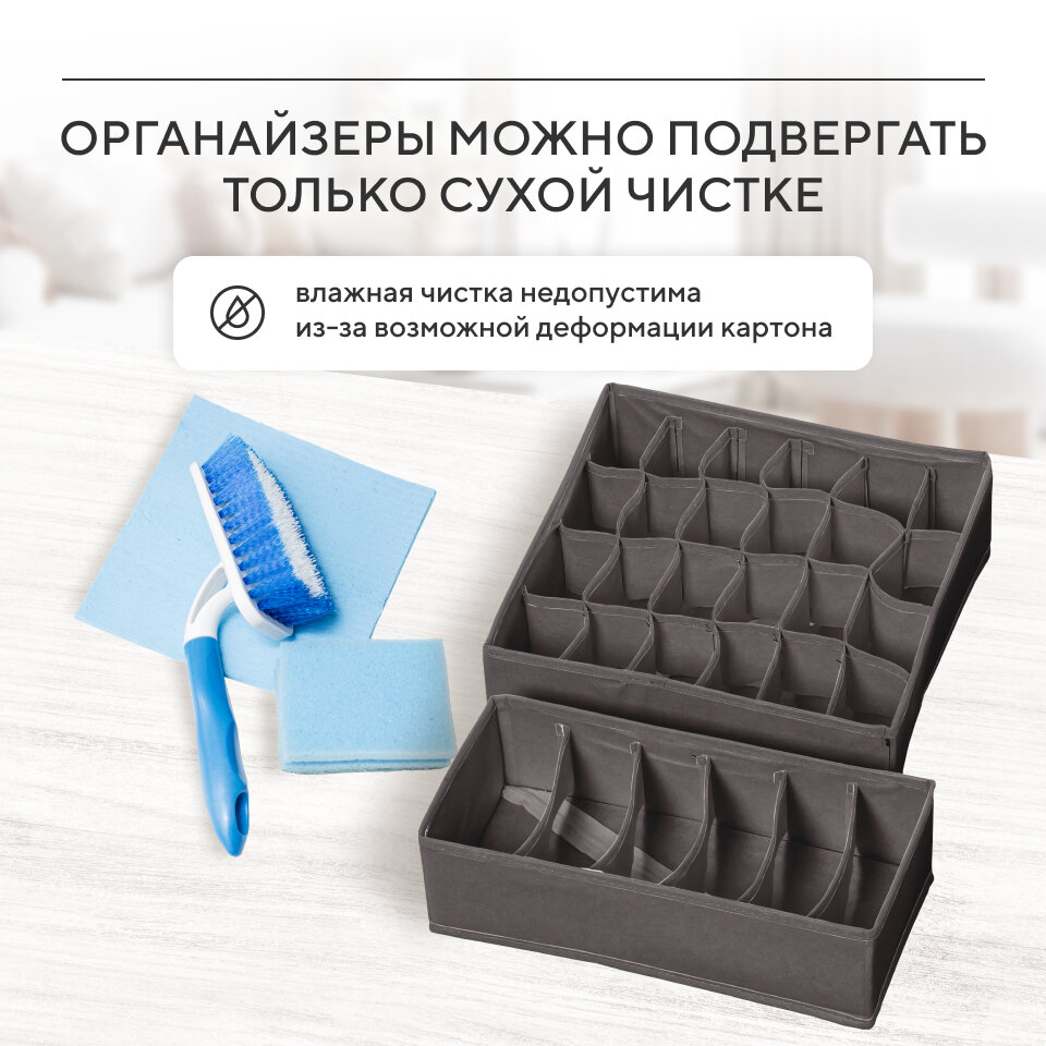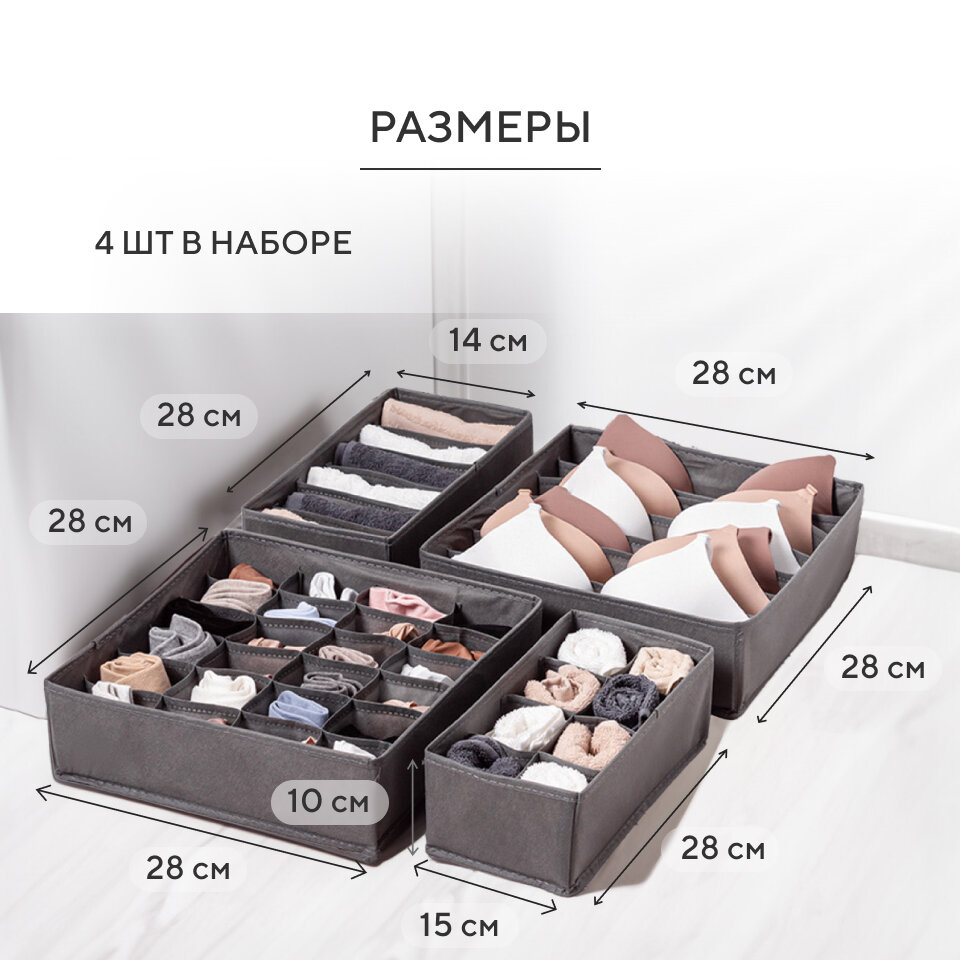 | Комплектация | Кофр для бюстгальтеров 7 ячеек - 1 шт, Кофр для носков и галстуков 8 ячеек - 1 шт, Кофр для нижнего белья 24 ячейки - 1 шт, Кофр для шарфов 6 ячеек - 1 шт |