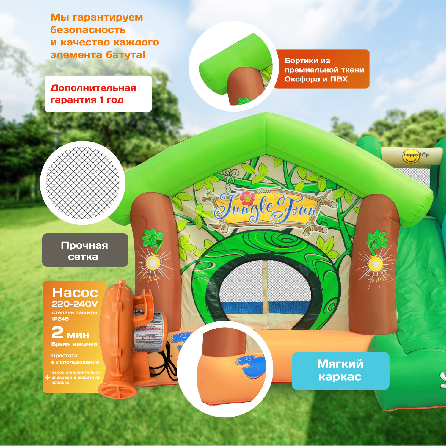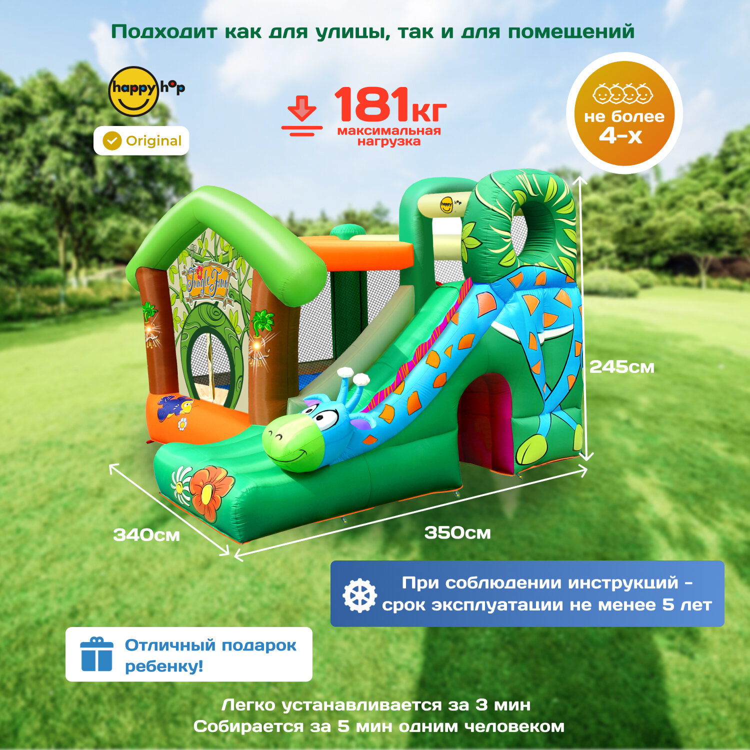 Детский надувной батут для дома и улицы Happy Hop "Джунгли", с горкой, с защитной сеткой, 390х330х270 см