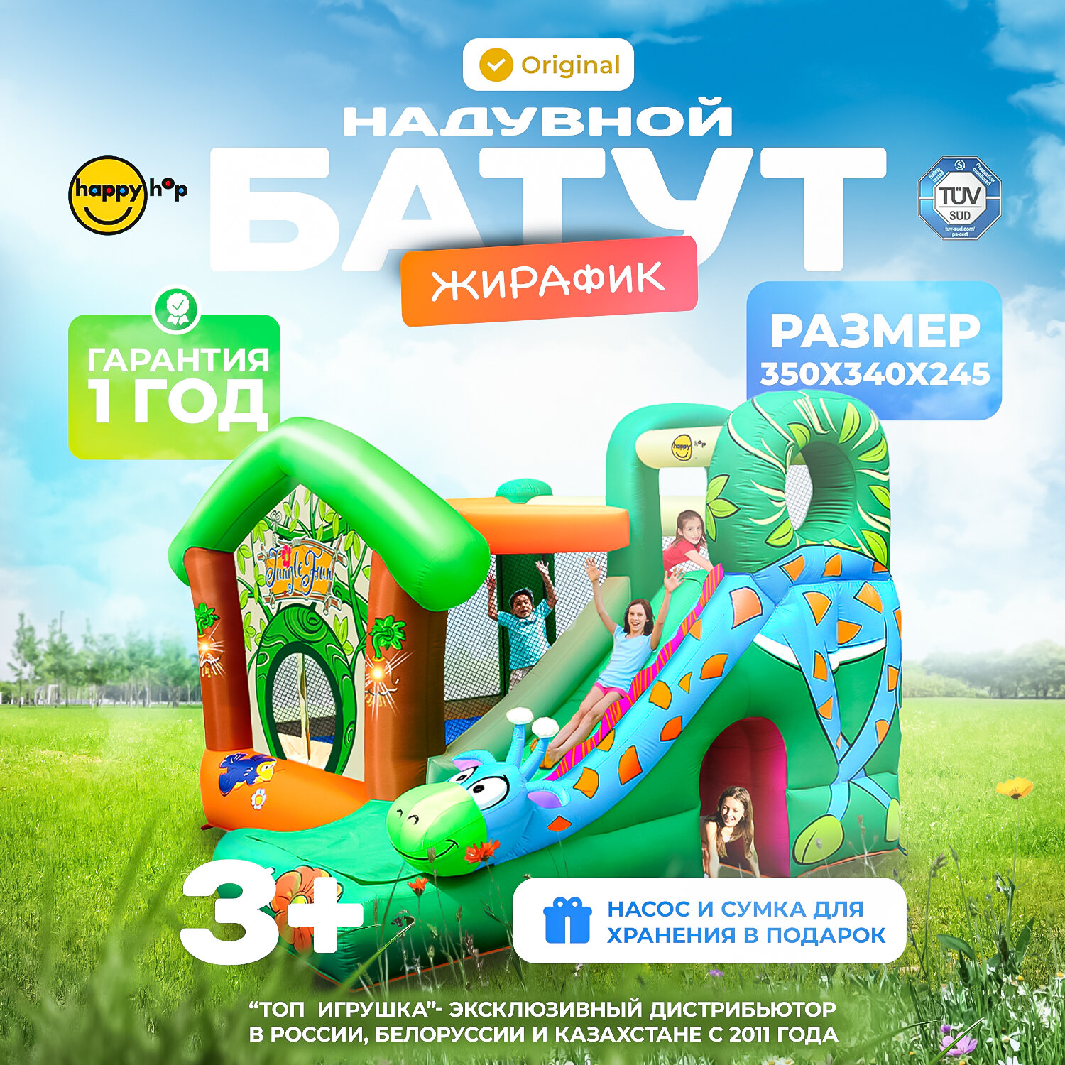 Купить Детский Надувной Батут для дома и улицы Happy Hop "Жирафик", с горкой и туннелем, с защитной сеткой, 350x340x245 см