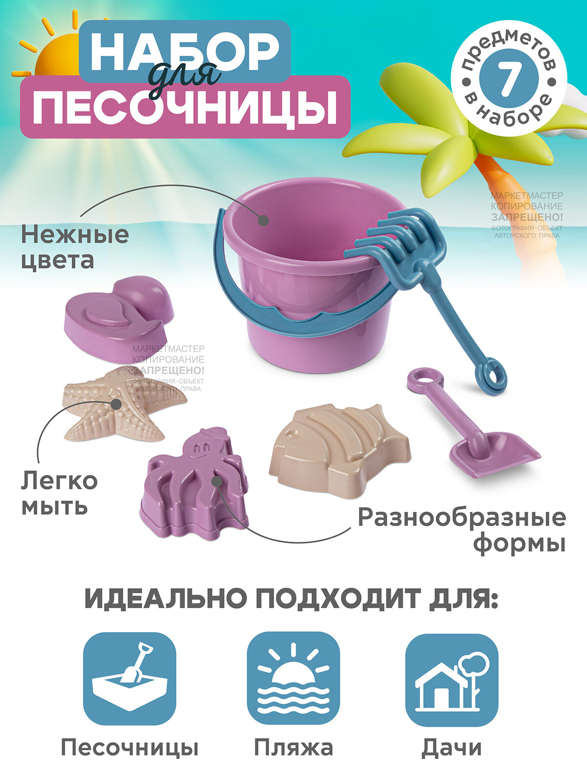 | Комплектация | ведро 0.8 л, лопатка 20 см, грабли 18 см, 2 формочки |