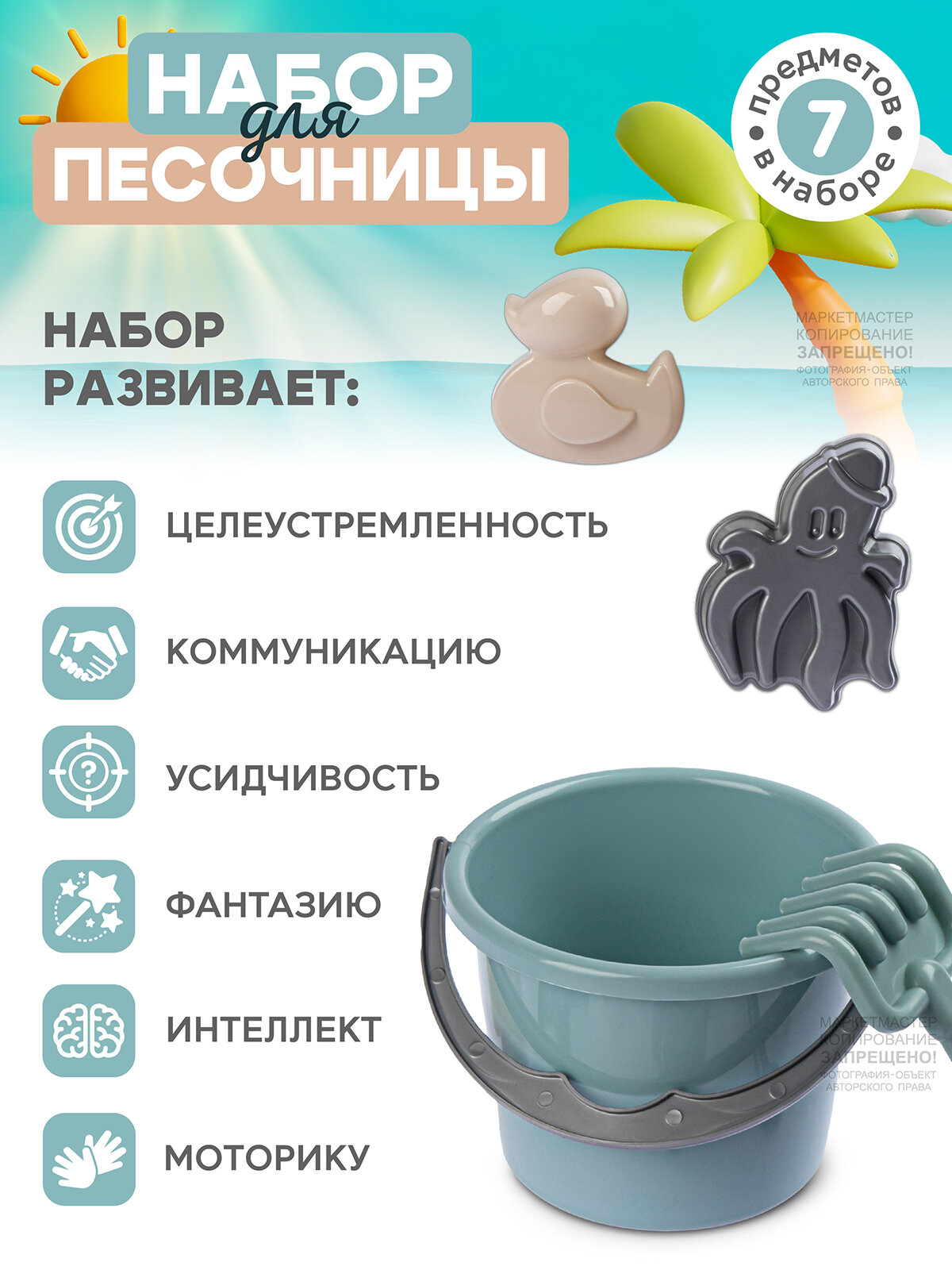 | Комплектация | ведро 0.8 л, лопатка 20 см, грабли 18 см, 2 формочки |