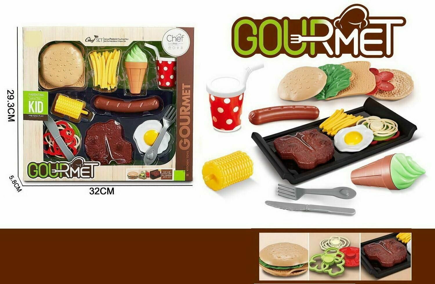 | Комплектация | тарелка, стейк, картошка фри, яичница, овощи нарезка – 3 шт., бургер – 5 шт., сосиска, кукуруза, мороженное, стакан, вилка, нож. |
