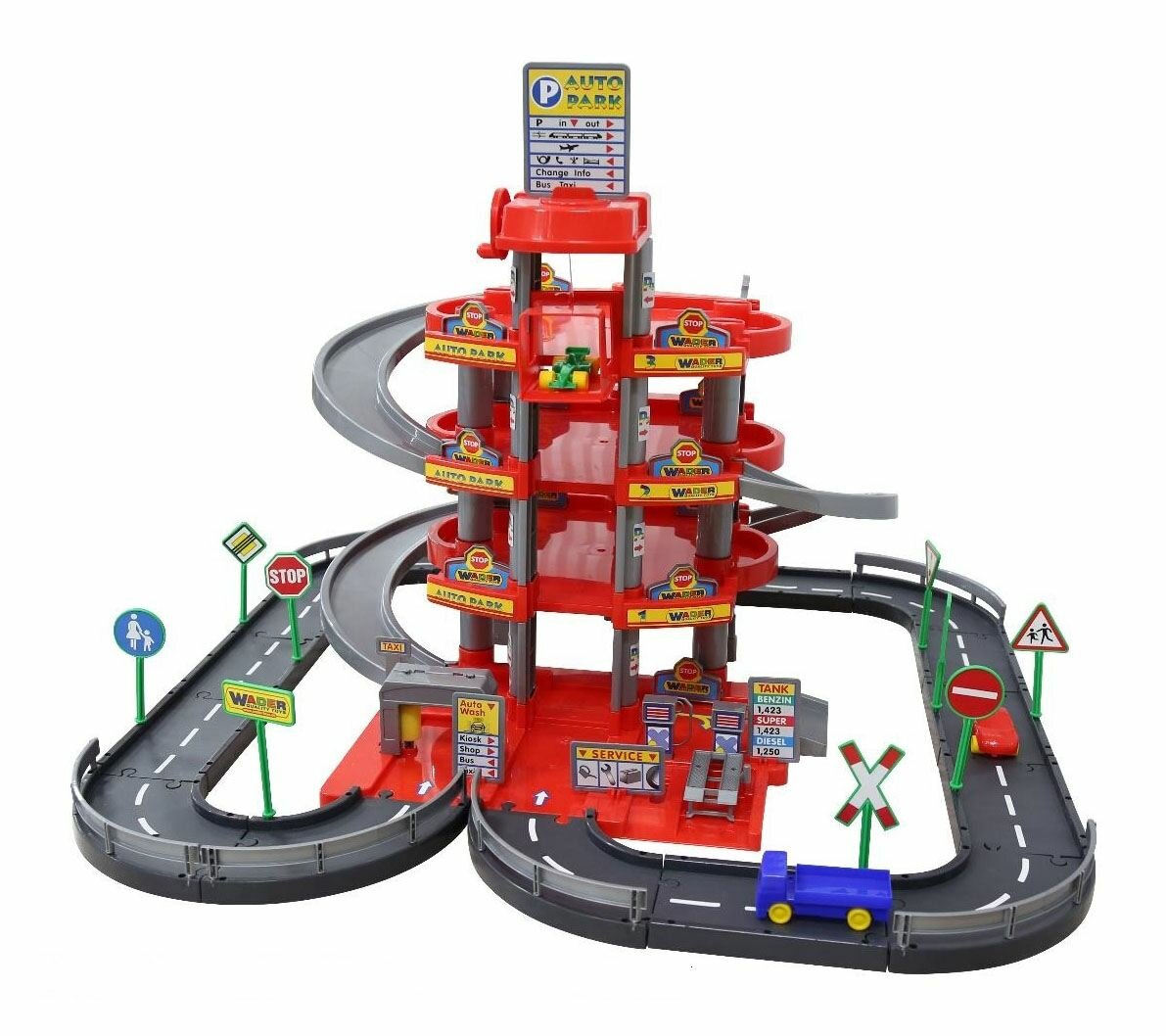 Игровой набор Wader 44723 Паркинг 4-уровневый с дорогой и автомобилями, красный (в коробке)