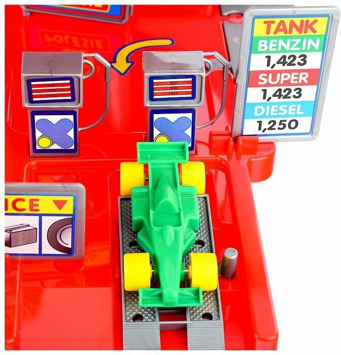 Паркинг для машинок 4-уровневый с дорогой, дорожными знаками, автомобилями, автомойкой, автозаправкой, автосервисом с эстакадой и лифтом (красный)
