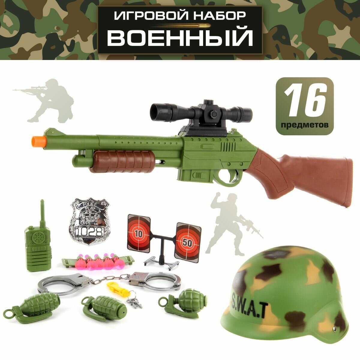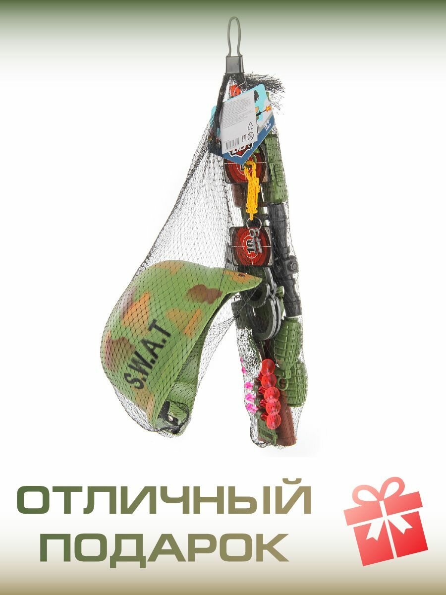 | Комплектация | игрушечное ружье, муляж рации, мишень на подставке, наручники, ключи к наручникам на карабине, жетон, 3 муляжа гранат, каска, обойма со снарядами, 5 снарядов на присоске |
