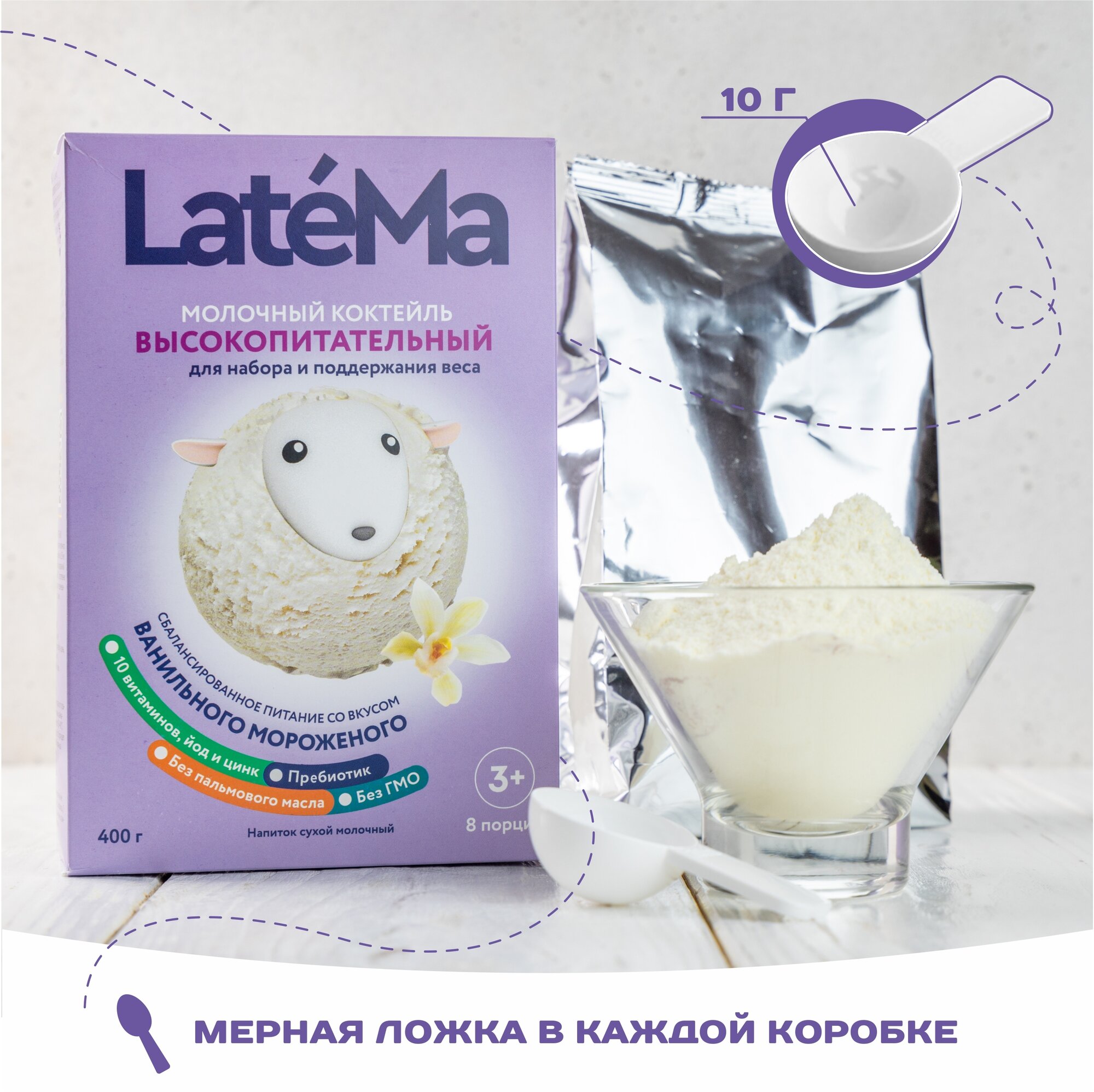 Купить Детская смесь LateMa (Латема) для приготовления молочного коктейля высокопитательная со вкусом ванильного мороженого; для детей от 3-х лет 400 г