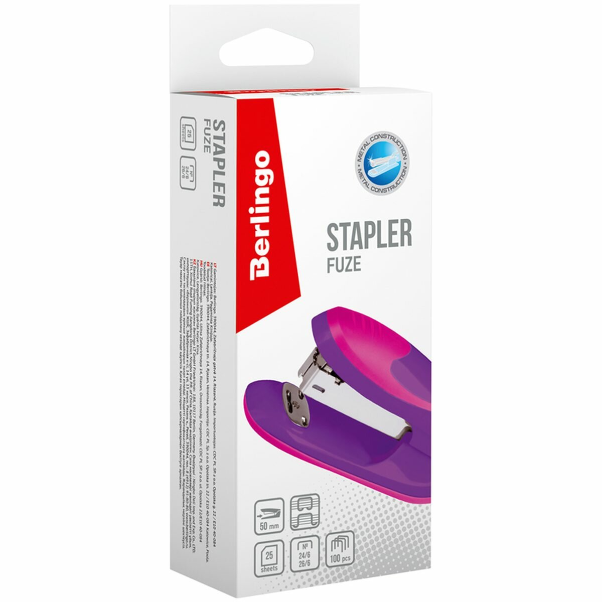 Степлер Berlingo №24/6, 26/6 "Fuze" до 25л., 100 скоб, пластиковый корпус, фиолетовый