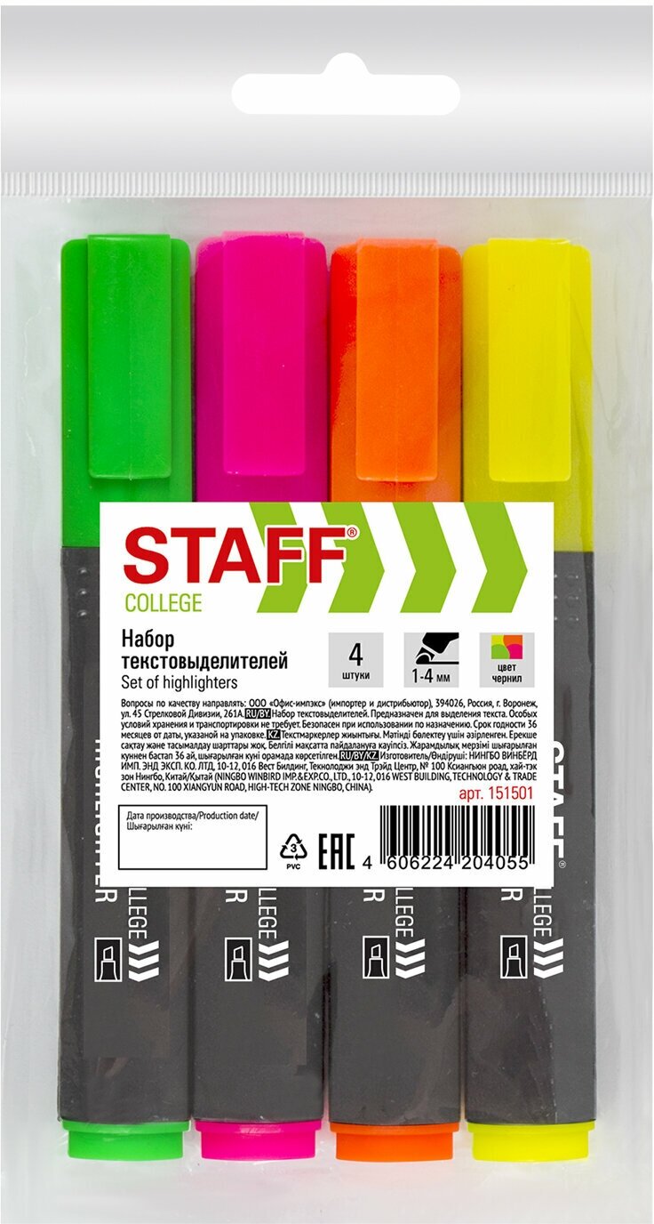 Маркер-текстовыделитель (для выделения текста) набор из 4 шт., Ассорти, Staff College Stick, линия письма 1-4 мм