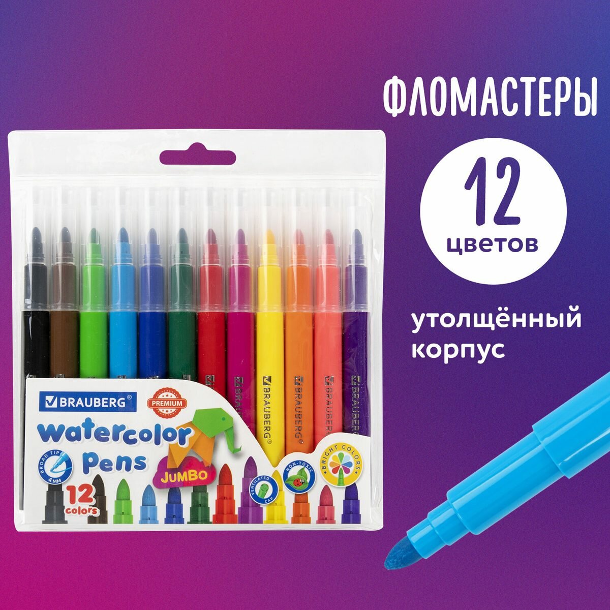 Набор фломастеров 12 цветов Brauberg Premium (линия 2мм, смываемые, утолщенные) ПВХ-упаковка, 12 уп. интересное: