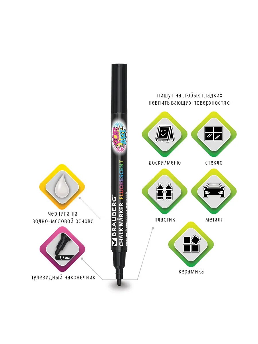 Маркер меловой "POP-ART" зеленый, 3,5 мм, стираемый, для гладких поверхностей, BRAUBERG, 151524