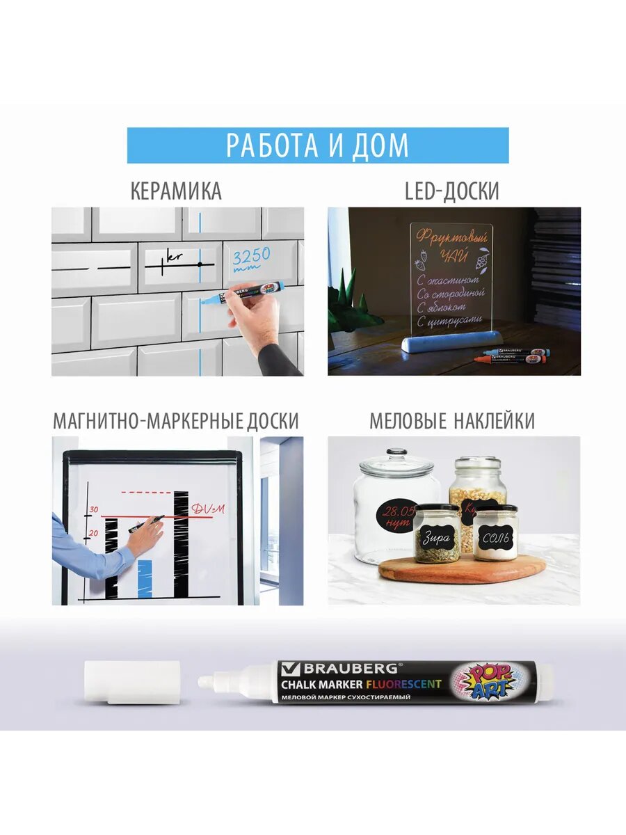 Маркер / фломастер меловой стираемый для доски Pop-art Белый, 3,5 мм, стираемый, для гладких поверхностей, Brauberg, 151519