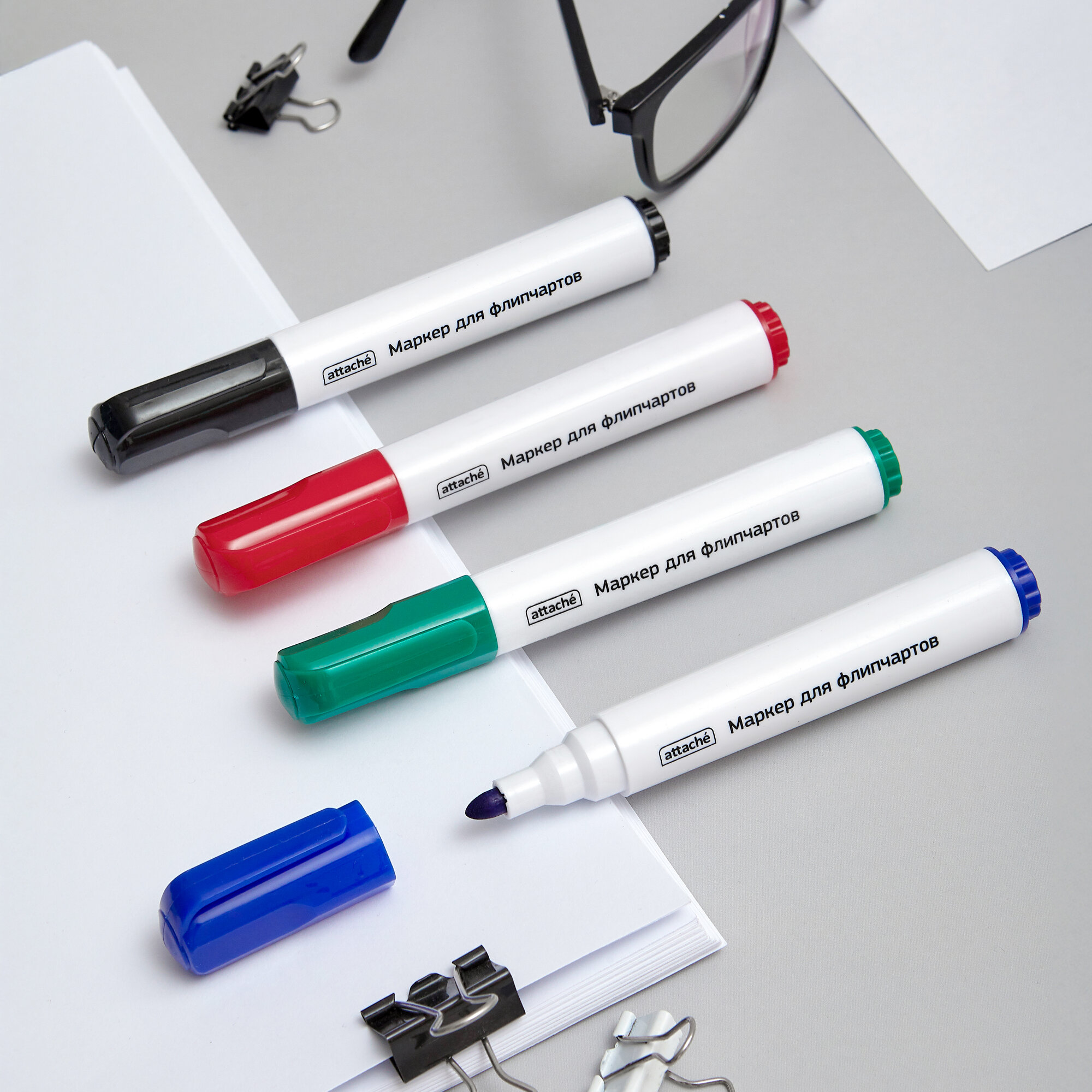 Набор маркеров для бумаги для флипчартов, для рисования и письма Attache, 4 цвета, стираемые, толщина линии 2-3 мм, круглый наконечник