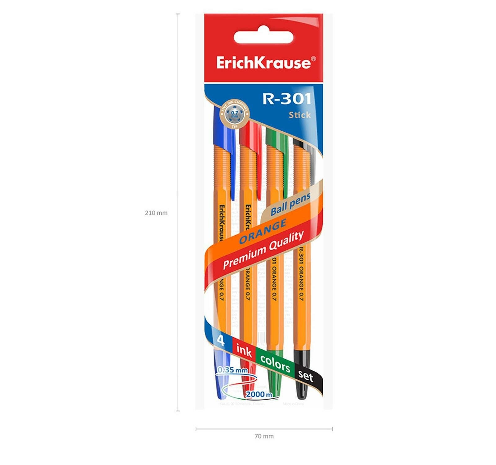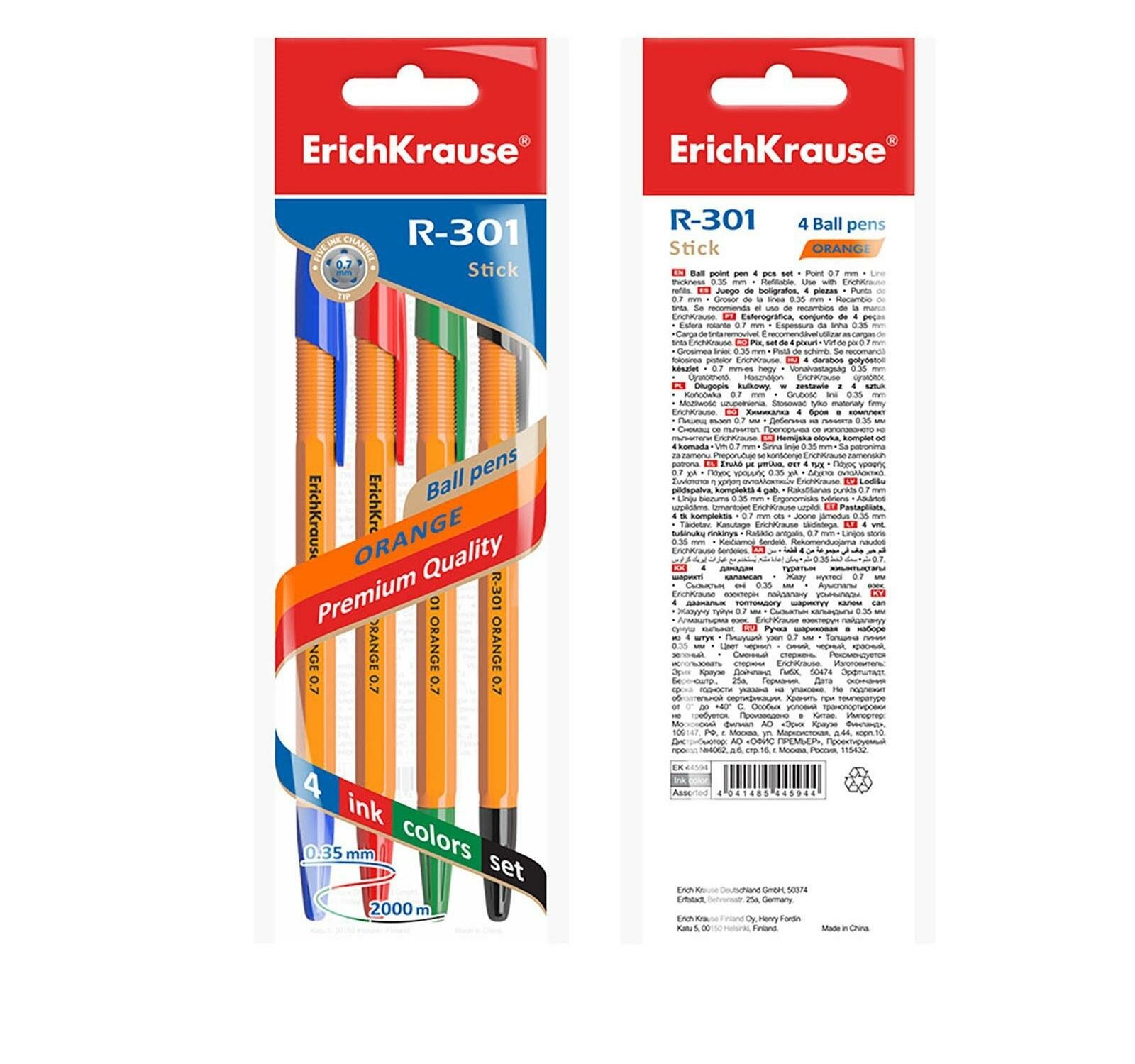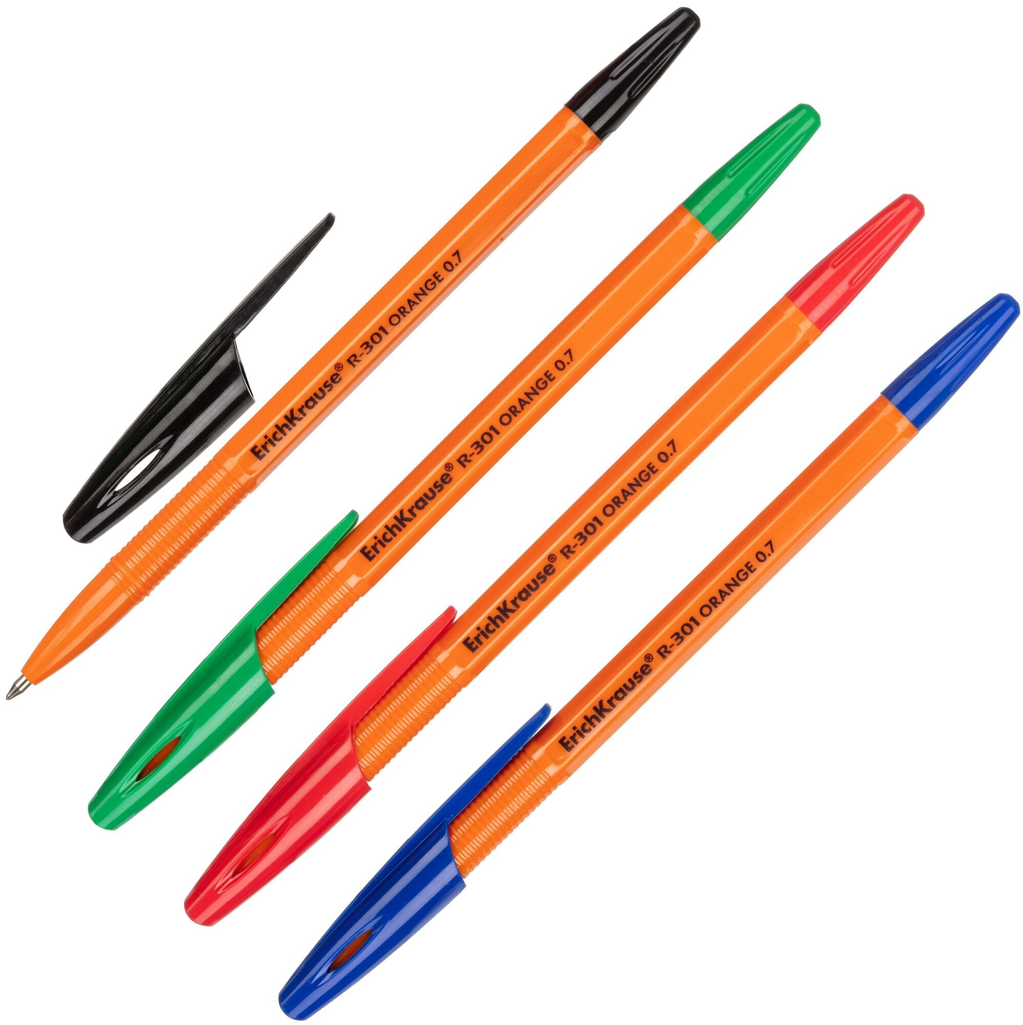 Ручка шариковая ErichKrause® R-301 Orange Stick 0.7, цвет чернил: синий, черный, красный, зеленый (в пакете по 4 шт.)