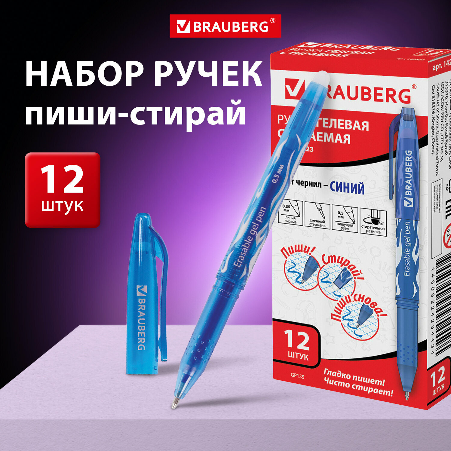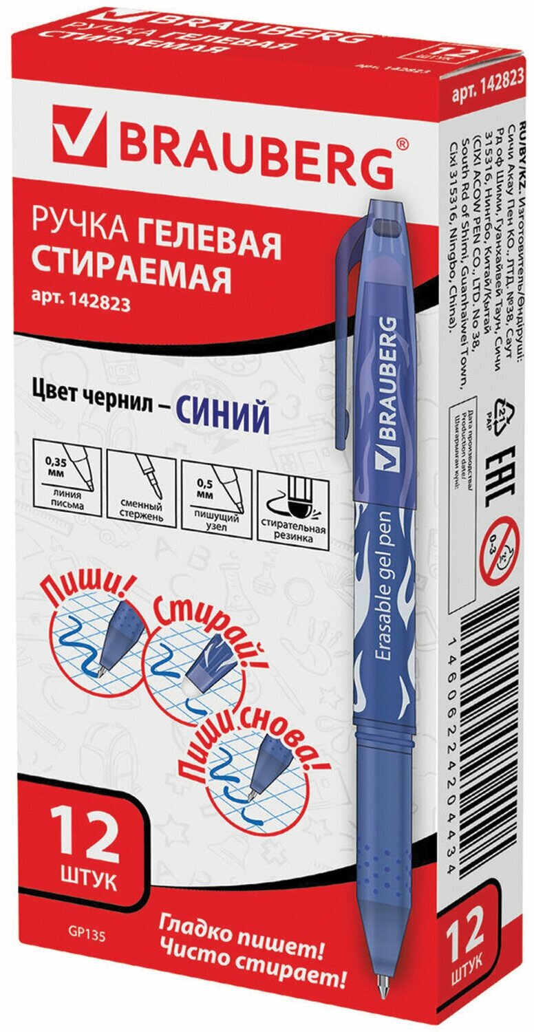 Ручка стираемая гелевая BRAUBERG, комплект 12 штук, синяя, узел 0,5 мм, линия 0,35 мм, 880219 интересное: