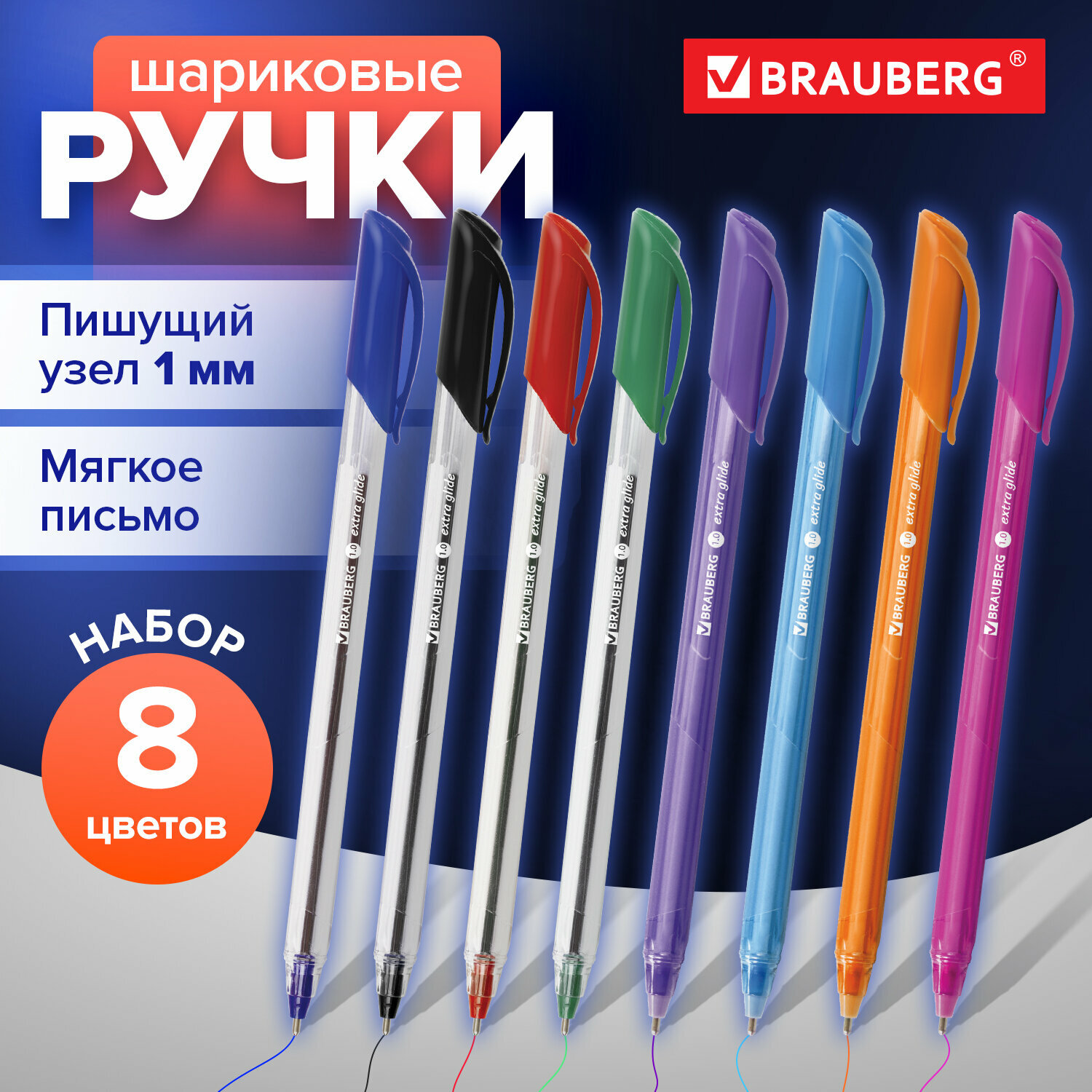 Ручки шариковые цветные масляные Brauberg "Extra Glide", 8 штук в упаковке, узел 1 мм, линия 0,5 мм