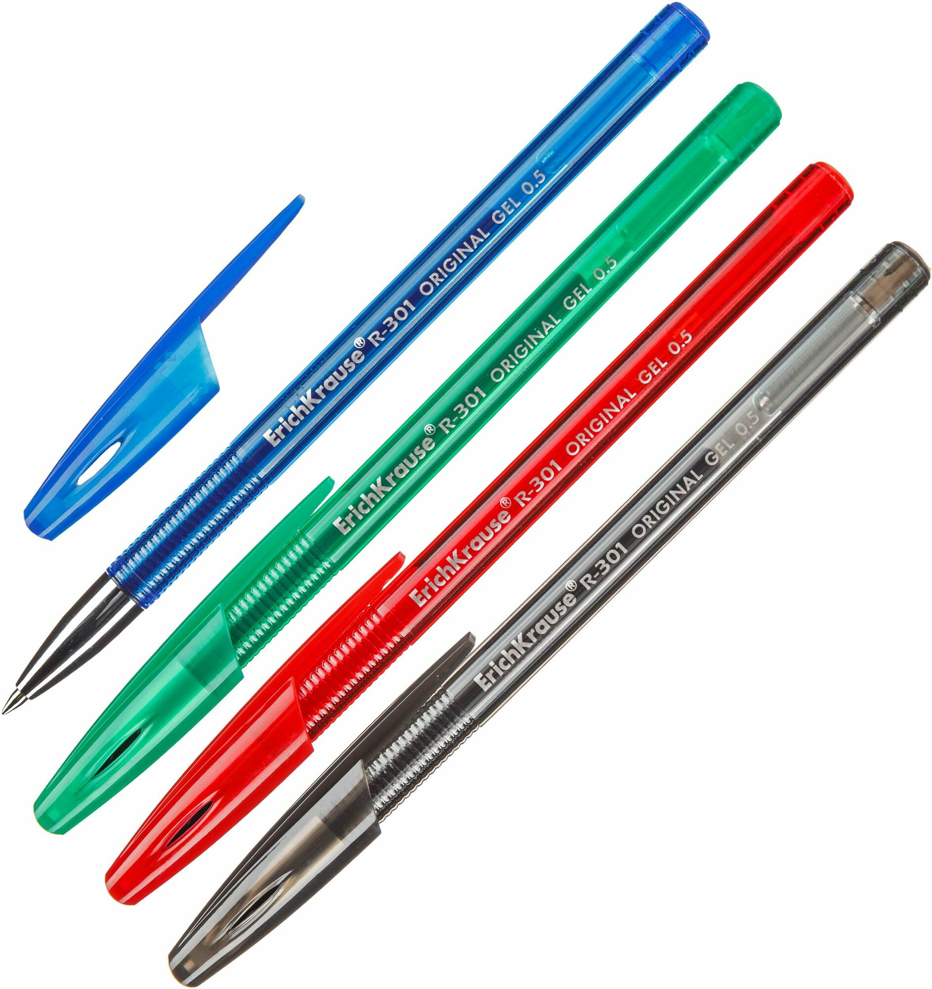 Ручка гелевая ErichKrause® R-301 Original Gel Stick 0.5, цвет чернил: синий, черный, красный, зеленый (в пакете по 4 шт.)