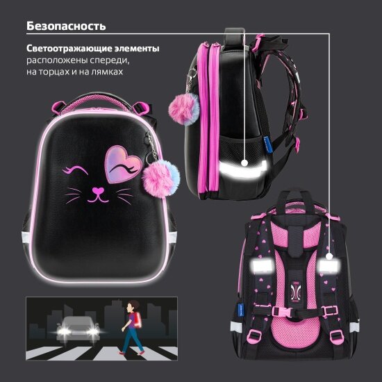 Ранец BRAUBERG SHINY, 2 отделения, с брелком, "Smiling cat", 38х28х14 см, 272040