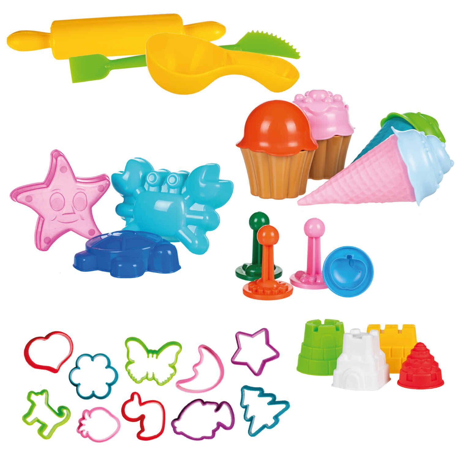 | Состав набора | 10 вырубных формочек, 4 штампика, 4 формочки "Замок", 2 двусоставные формочки "Кексики", 2 двусоставные формочки "Мороженое", 3 формочки "Морской мир", стек, скалка, ложка. |