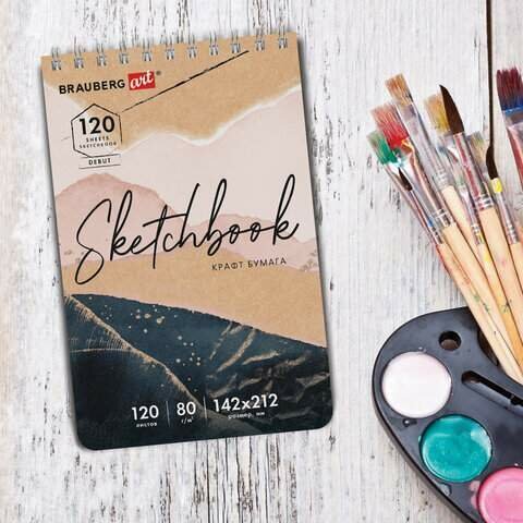 Блокнот-Скетчбук для рисования эскизов, крафт-бумага 80 г/м2, 142х212 мм, 120 л, гребень, твердая обложка, Brauberg Art Debut, 112998