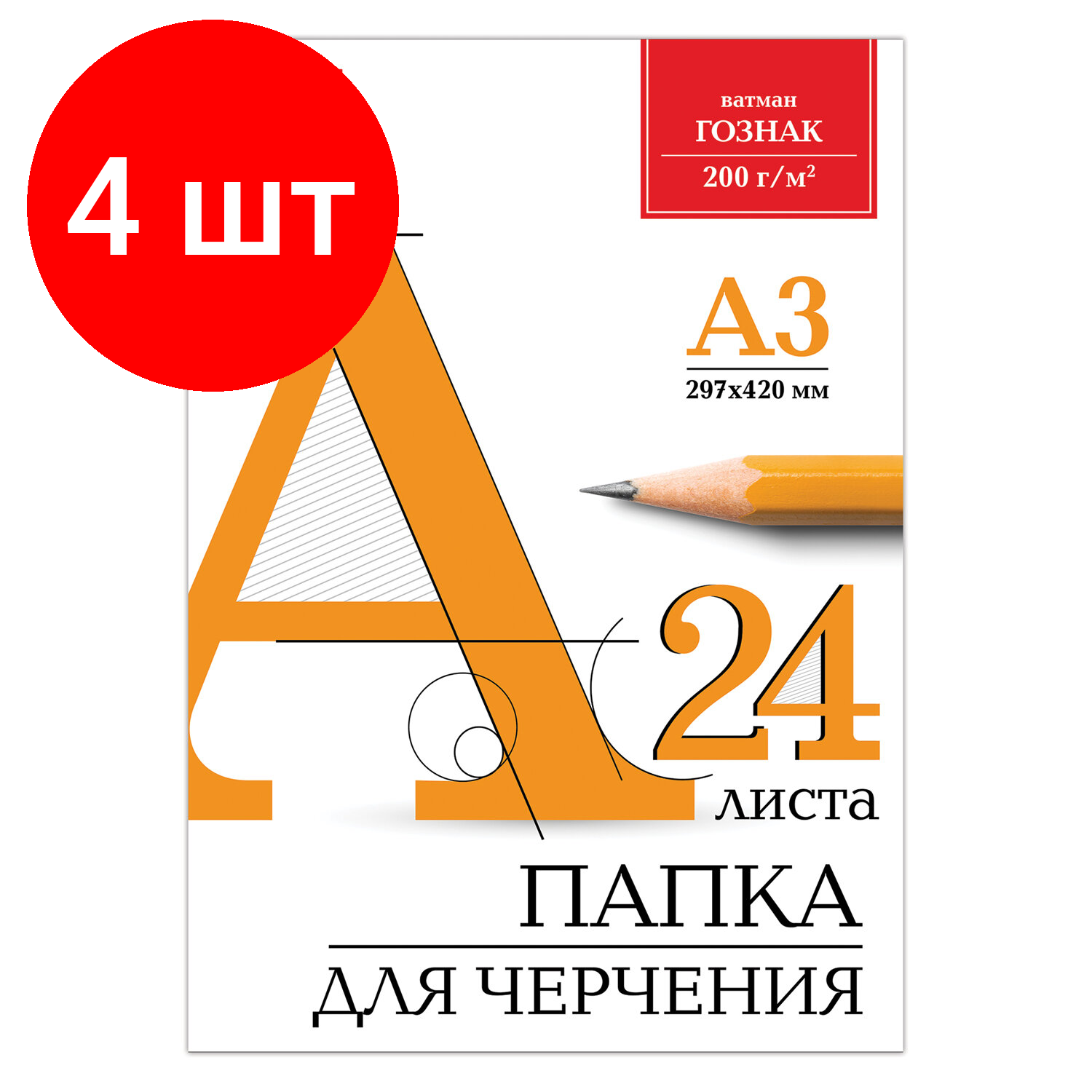 Купить Комплект 4 шт, Папка для черчения большого формата (297х420 мм) А3, 24 л, 200 г/м2, без рамки, ватман гознак КБФ, BRAUBERG, 129254
