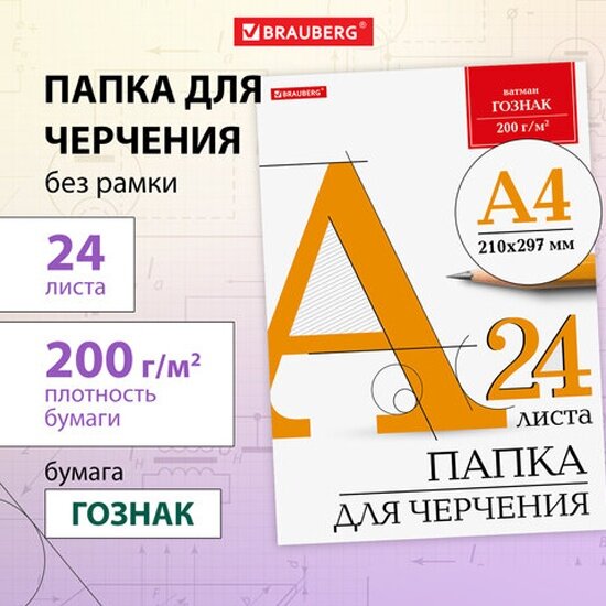 Папка для черчения Brauberg А4, 210х297 мм, 24 л., 200 г/м2, без рамки, ватман гознак КБФ, , 129255