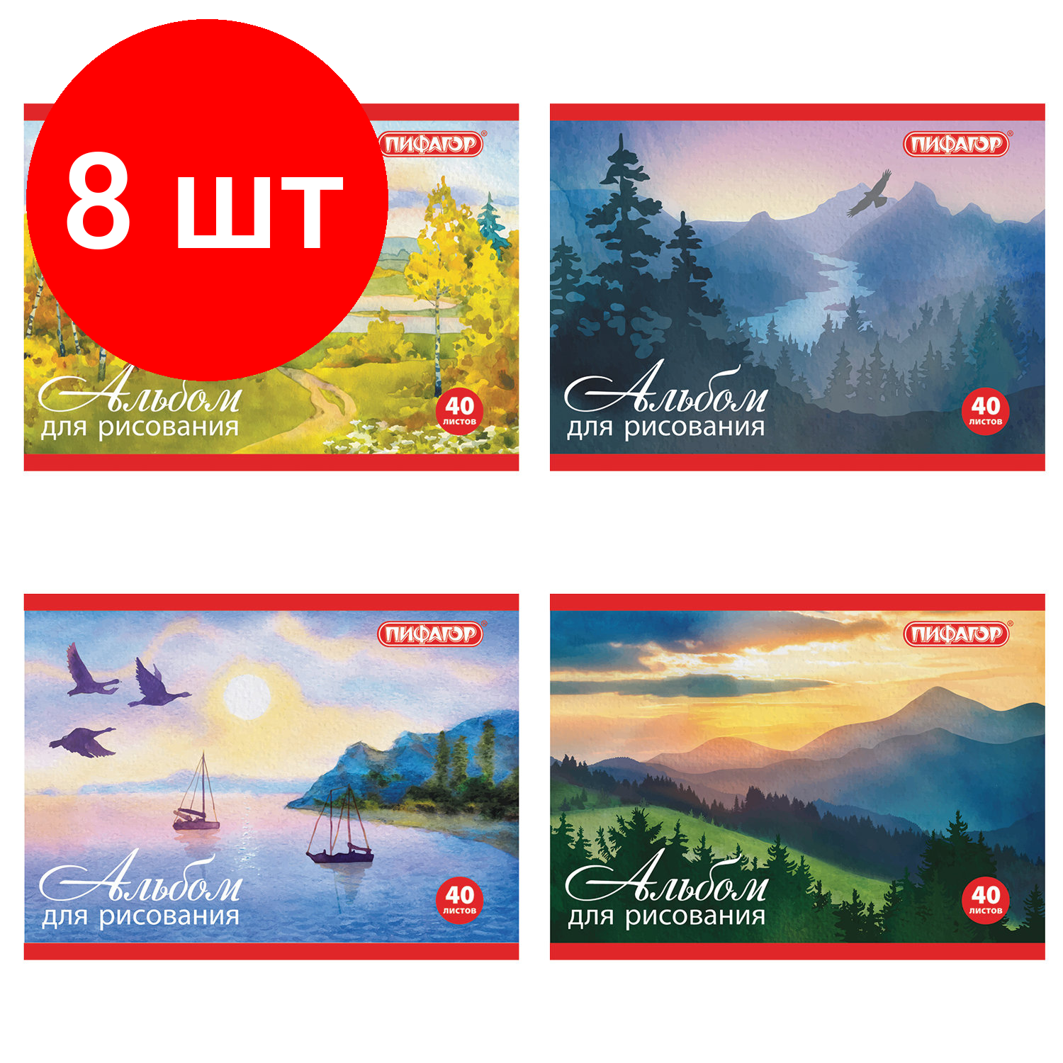 Купить Комплект 8 шт, Альбом для рисования, малый формат А5, 40 л, скоба, обложка офсет, пифагор, 200х148 мм, "Природа" (4 вида), 104873