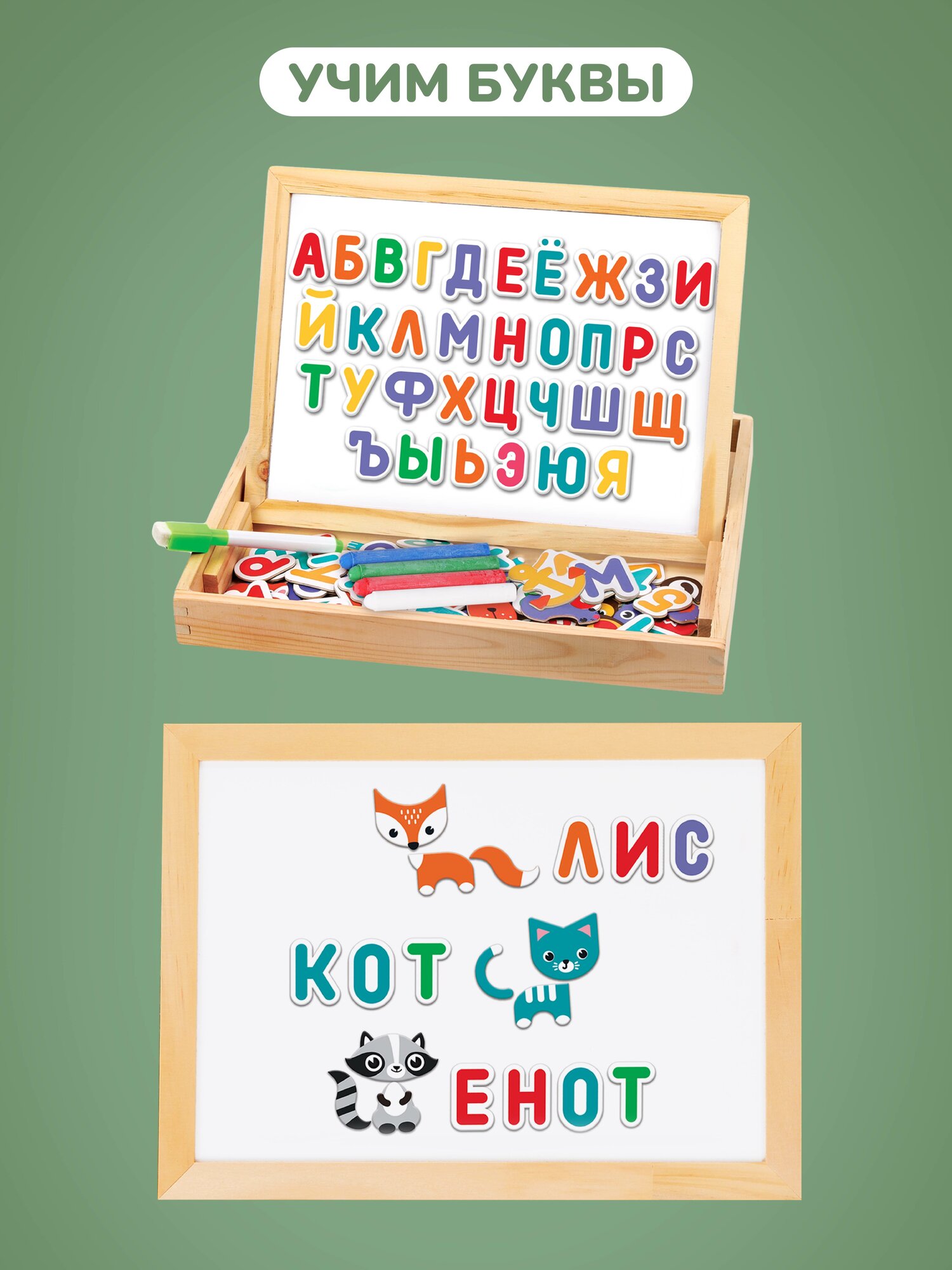 | В комплект входит | детали на магнитах в виде букв русского алфавита, цифр, животных и фруктов, мелки, маркер |