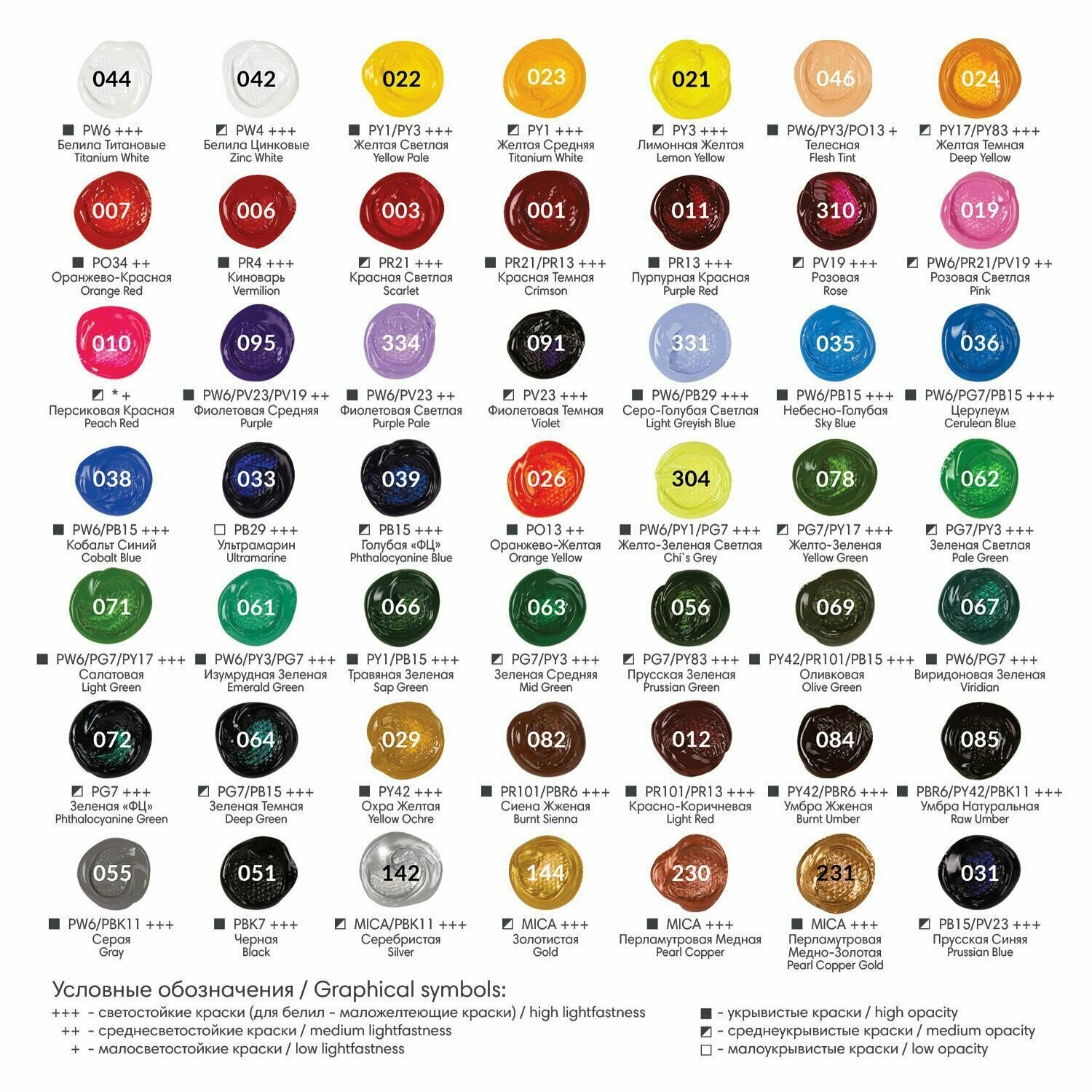 | Дополнительная информация | цвета: белила титановые (044), виридоновый зеленый (067), красная светлая (003), лимонная желтая (021), сиена жженая (082), ультрамарин (033), фиолетовый средний (095), черный (051) |