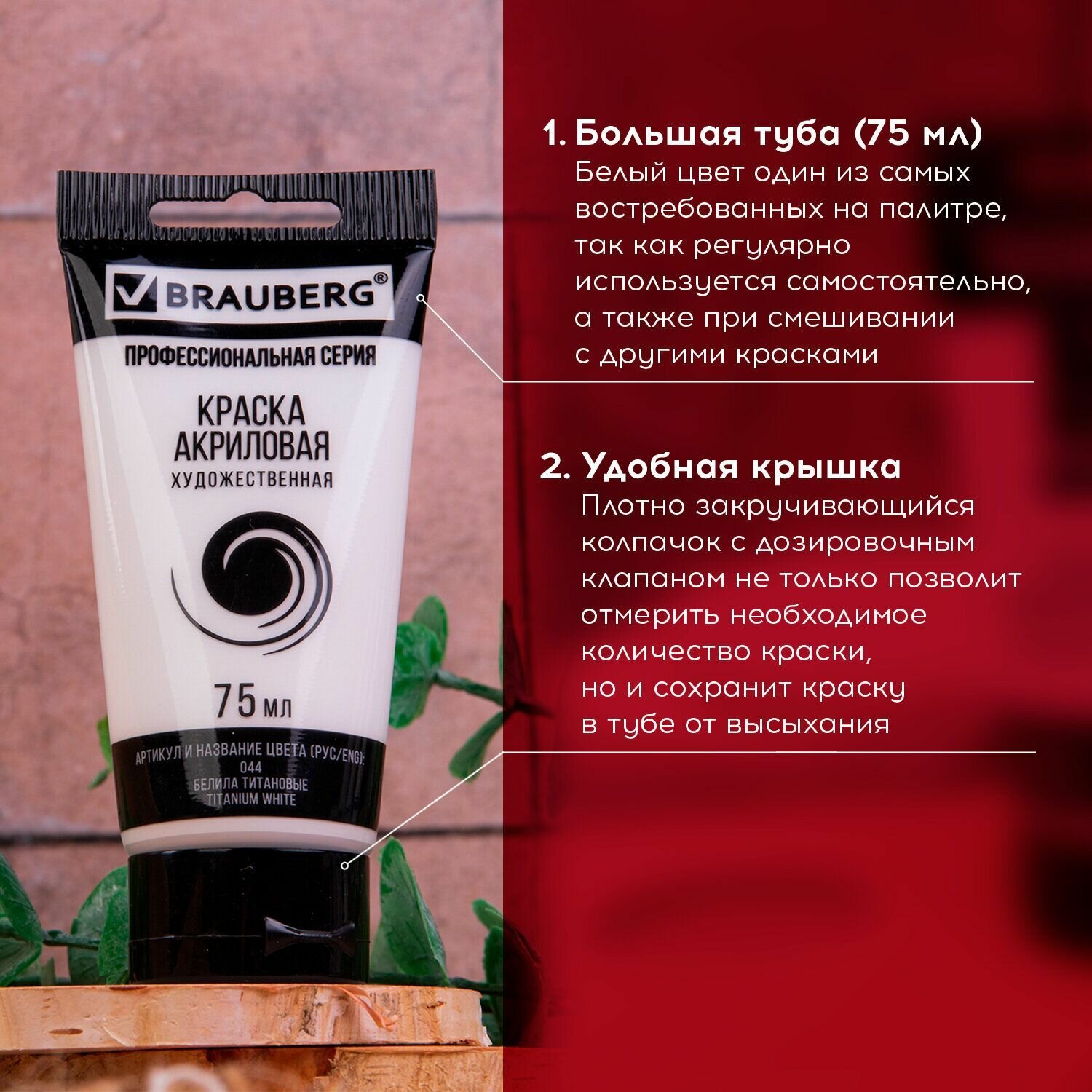 Краски акриловые Brauberg ART Classic художественные профессиональные для рисования и творчества, Набор 2 штуки, тубы 75мл, белила титановые