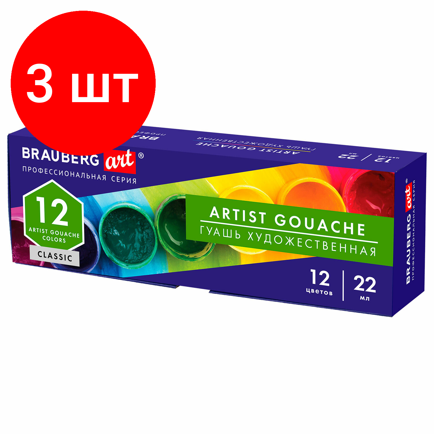 Гуашь художественная BRAUBERG ART CLASSIC набор 12 цветов в баночках по 22 мл, 3 шт