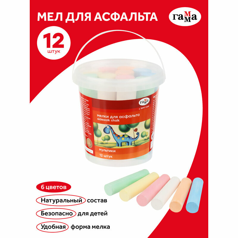 Купить Мелки для асфальта Гамма "Мультики" цветные 12шт, круглые, пластиковое ведро NEW