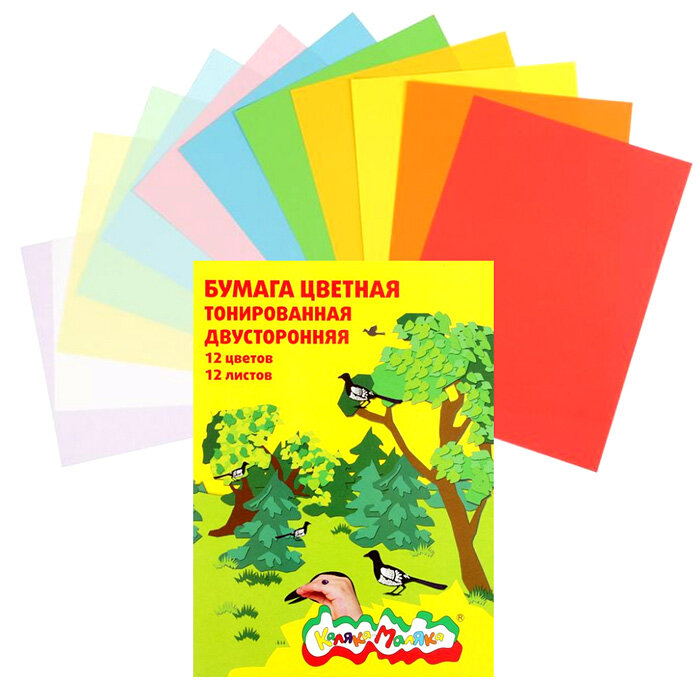 Бумага цветная 2-стороняя тонированния офсетная Каляка-Маляка А4, 12 цветов 12 листов, 80 г/м2 в папке