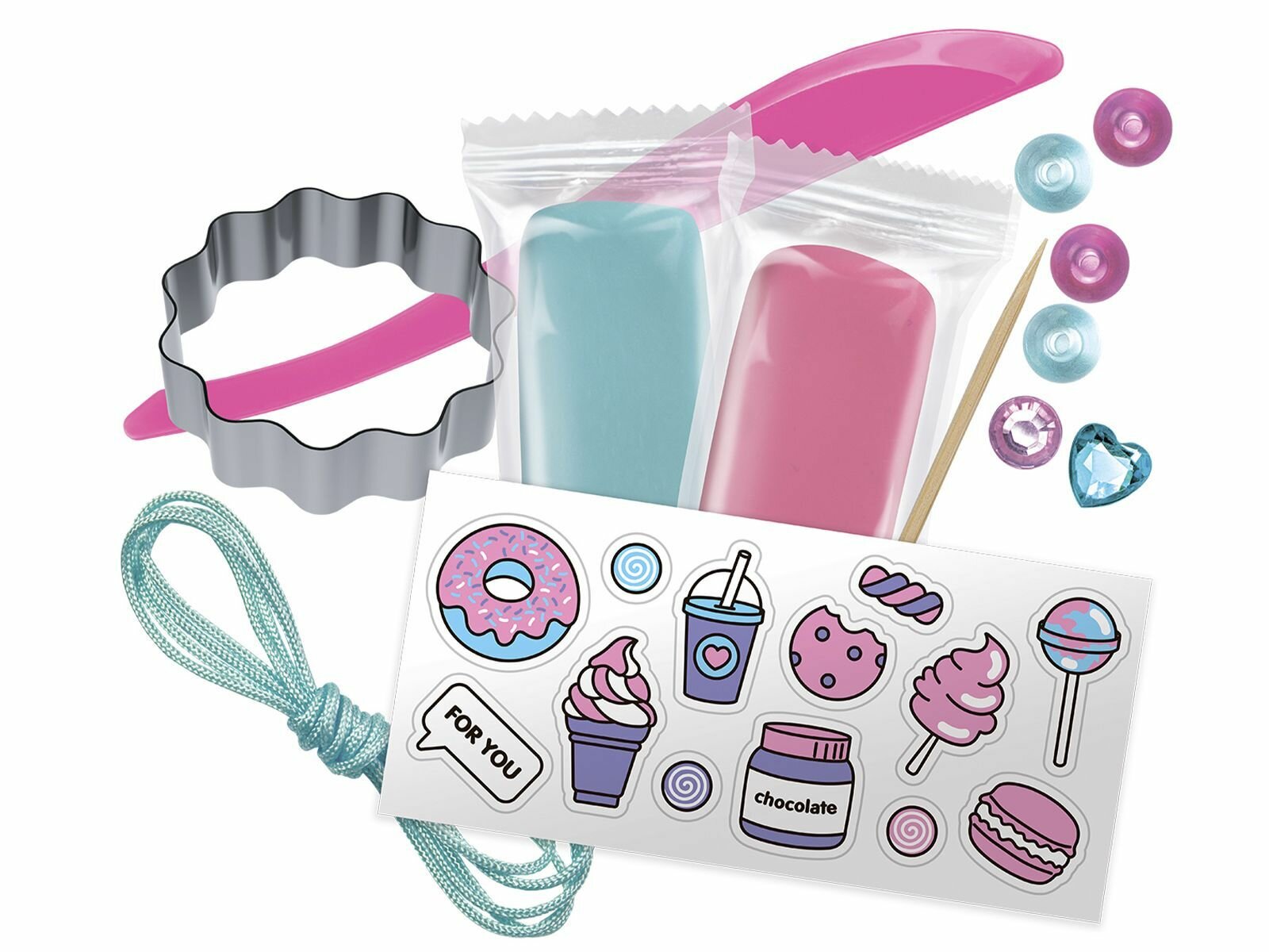 | Комплектация | полимерная глина самозатвердевающая - 2 шт, рязмягчитель для глины, каттер, шнурок и бусины, стразы, стикеры |