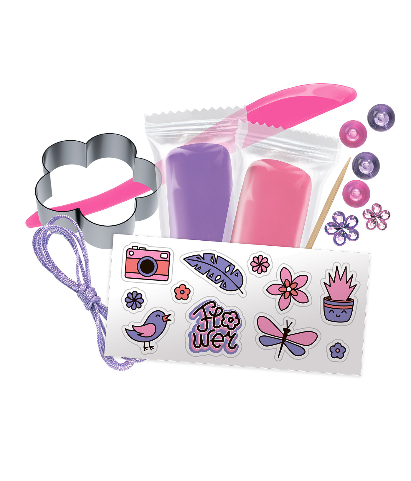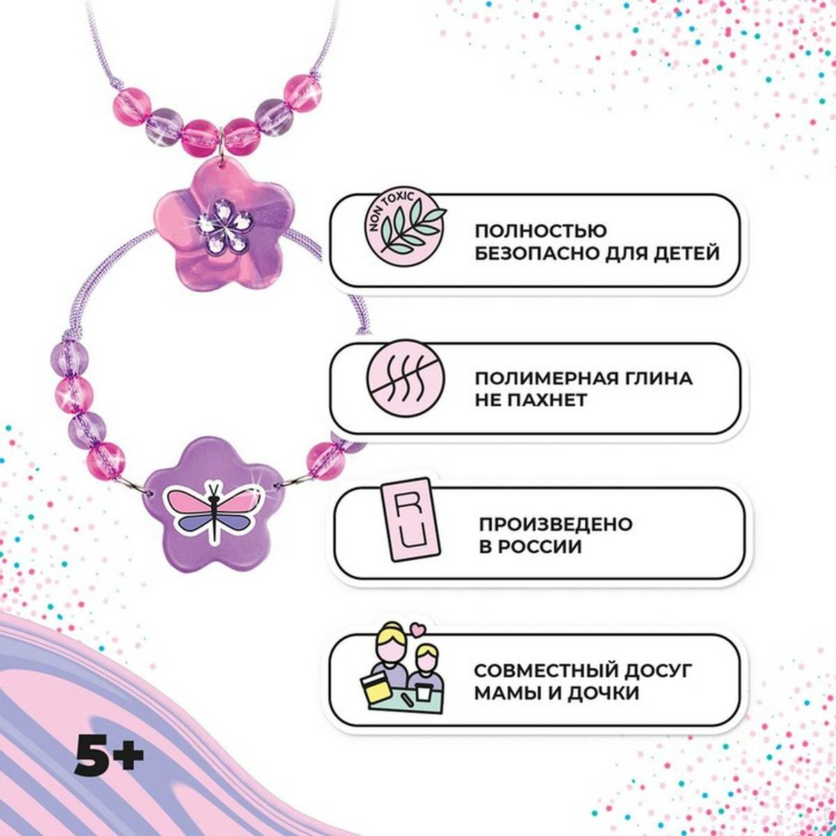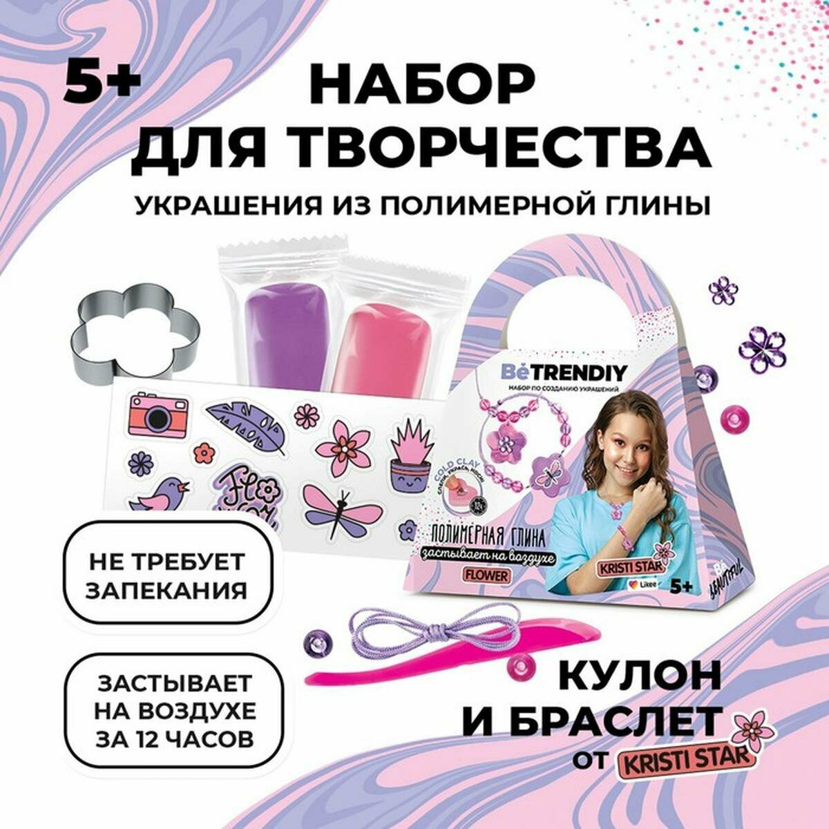 | Комплектация | полимерная глина самозатвердевающая - 2 шт, рязмягчитель для глины, каттер, шнурок и бусины, стразы, стикеры |