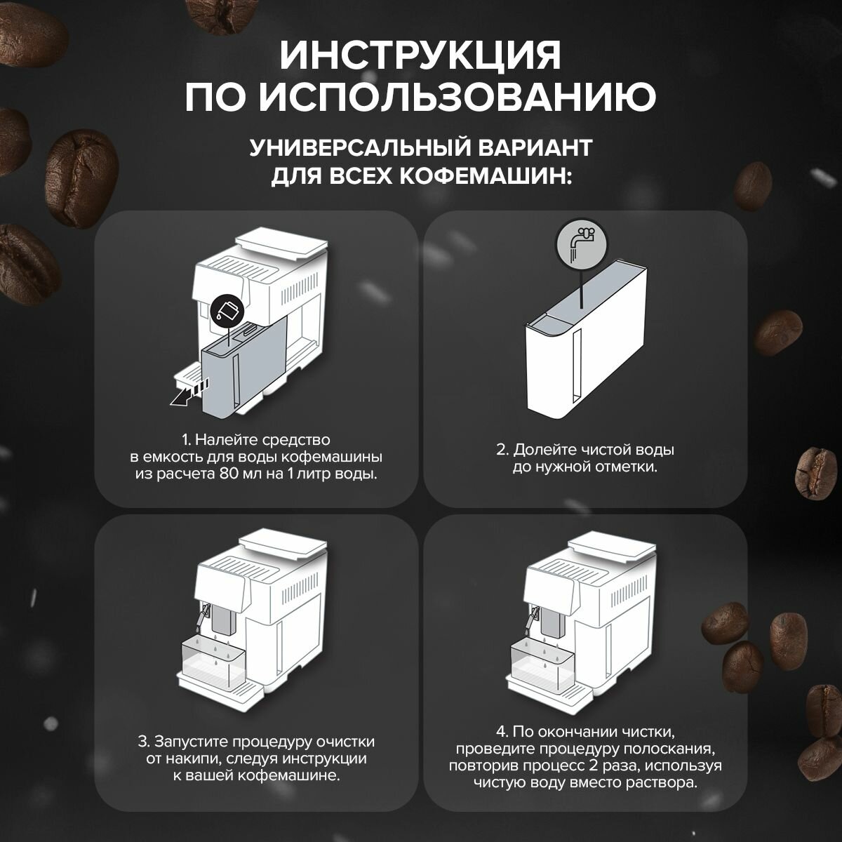 | Способ применения | позволяет удалить известковые отложения всего за 10 минут. Подходит для всех моделей и брендов. |