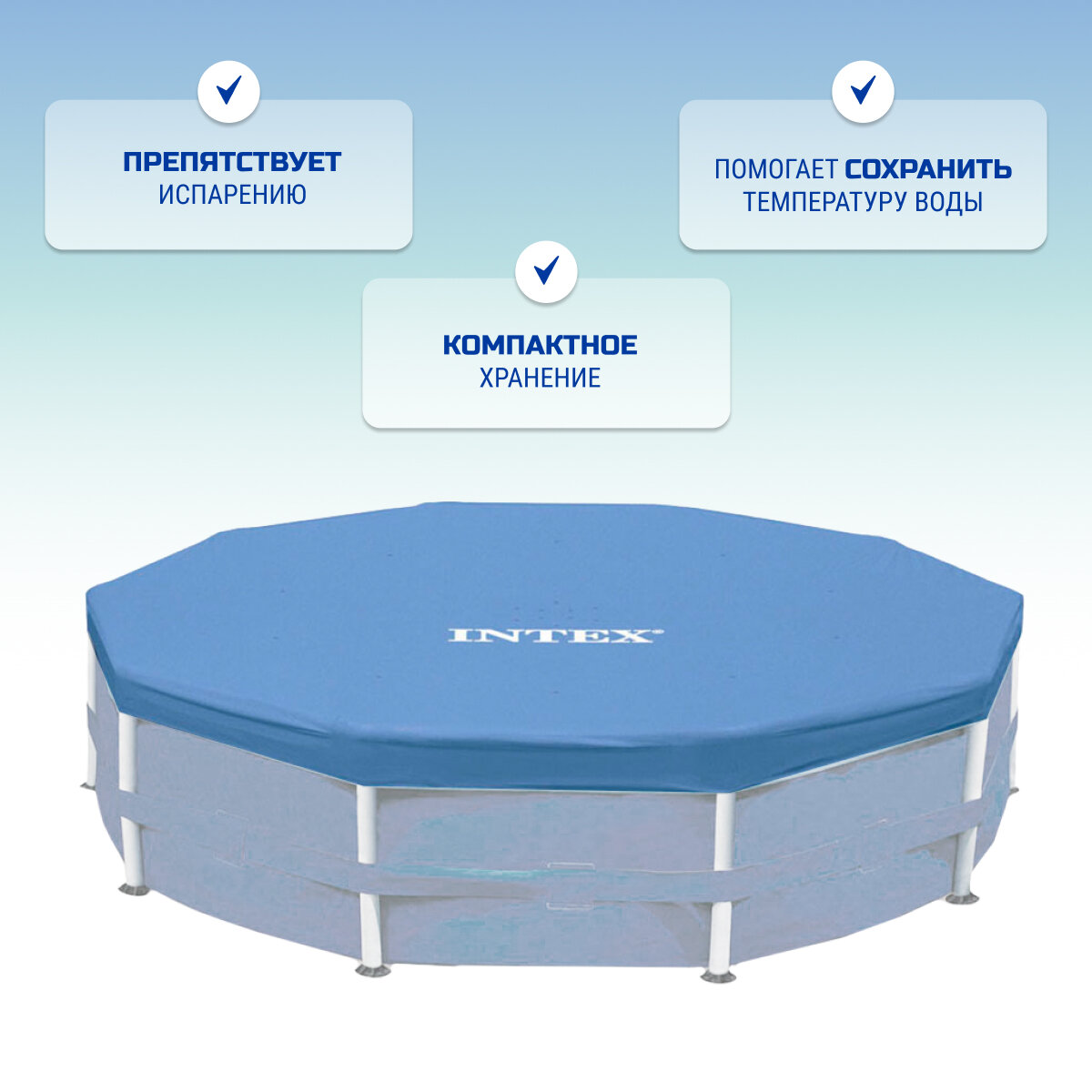 | Дополнительная информация | подходит для бассейнов Metal Frame pools диаметром 457 см; крепится по периметру шнуром, который пропускается по нижней стороне тента |