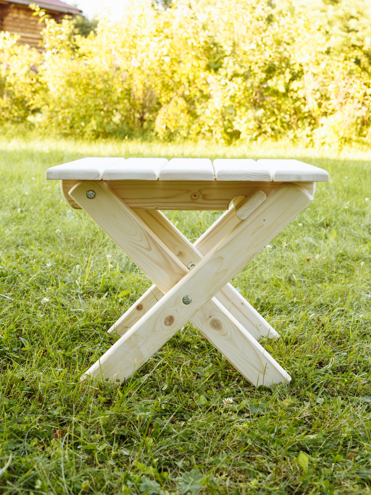 Шезлонг "Wooden World" - складной шезлонг из натурального дерева и тканью в клетку для дачи и отдыха