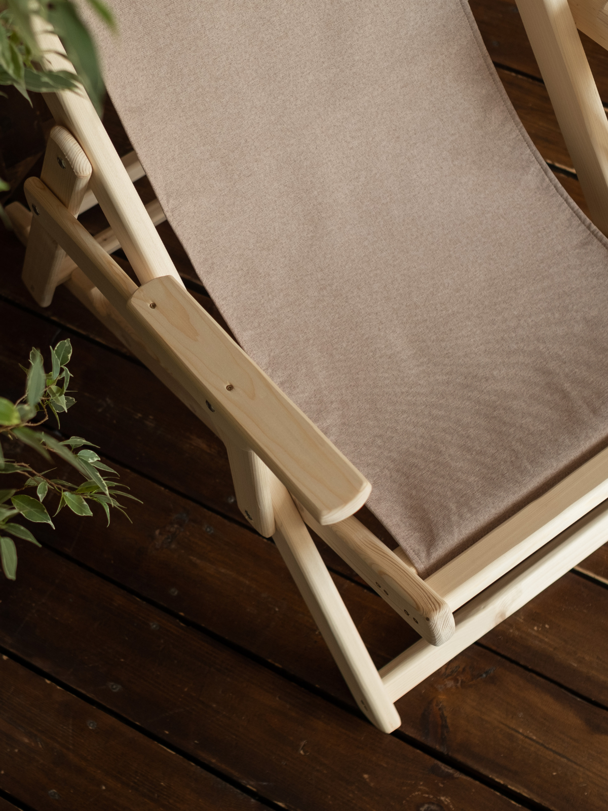 Шезлонг с светло-серой тканью и подлокотниками, деревянный, складной
