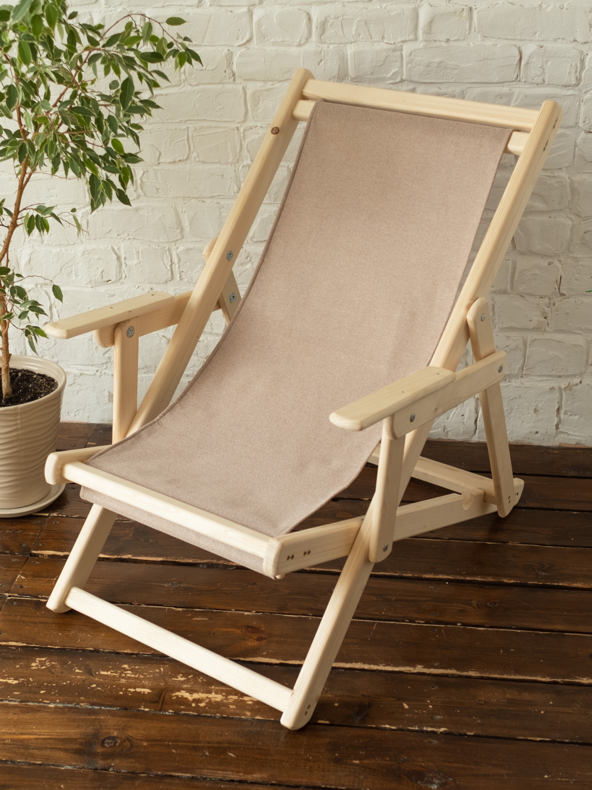 Шезлонг с бежевой тканью и подлокотниками, деревянный, складной