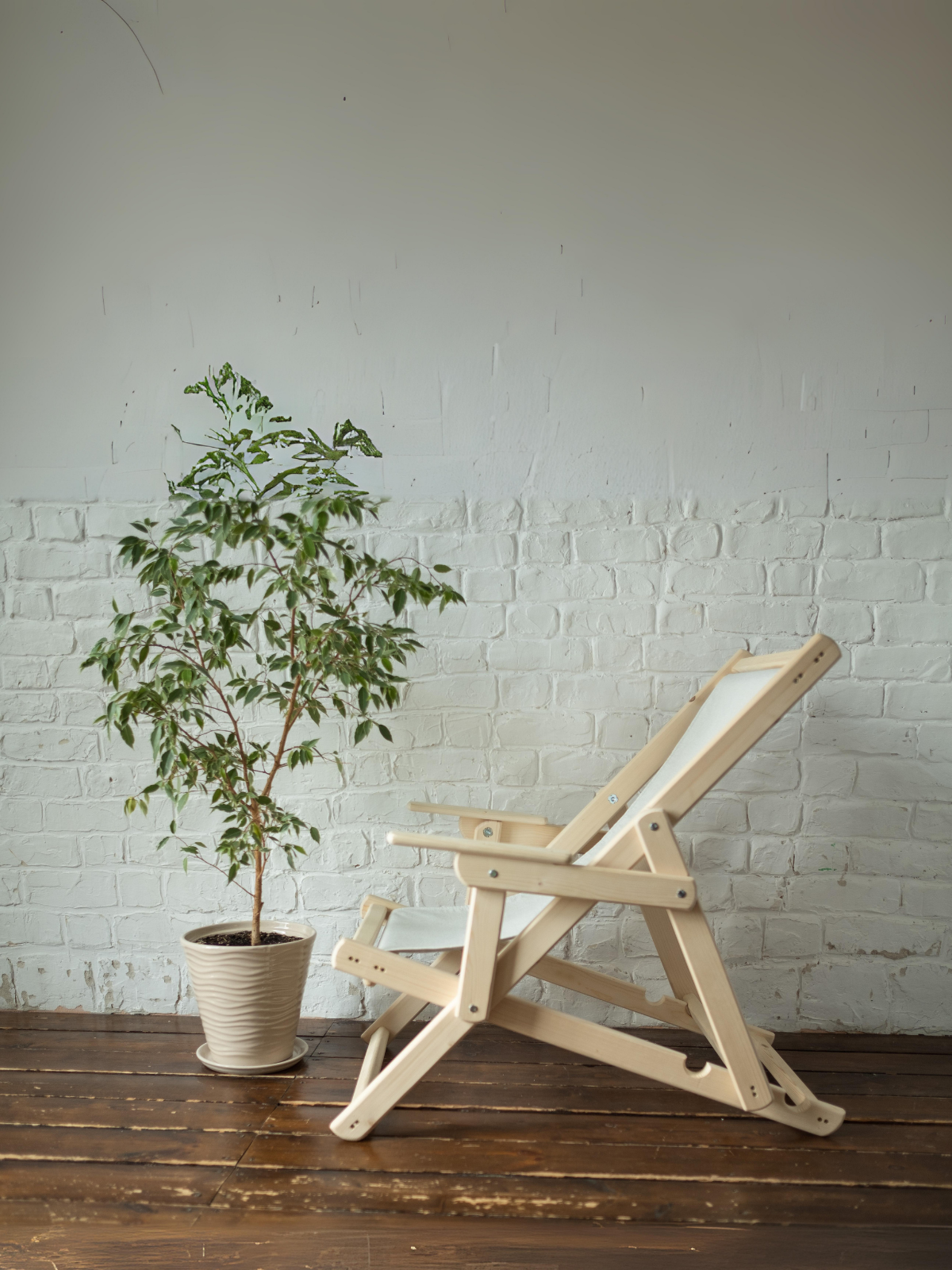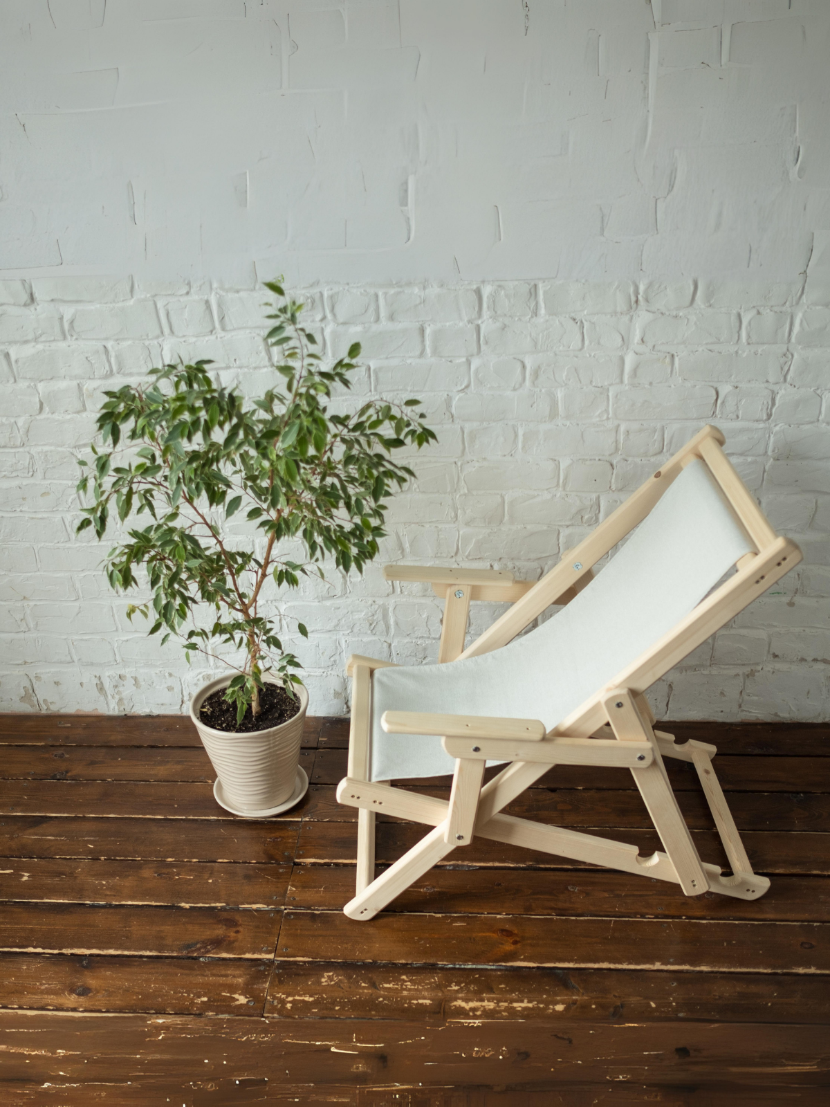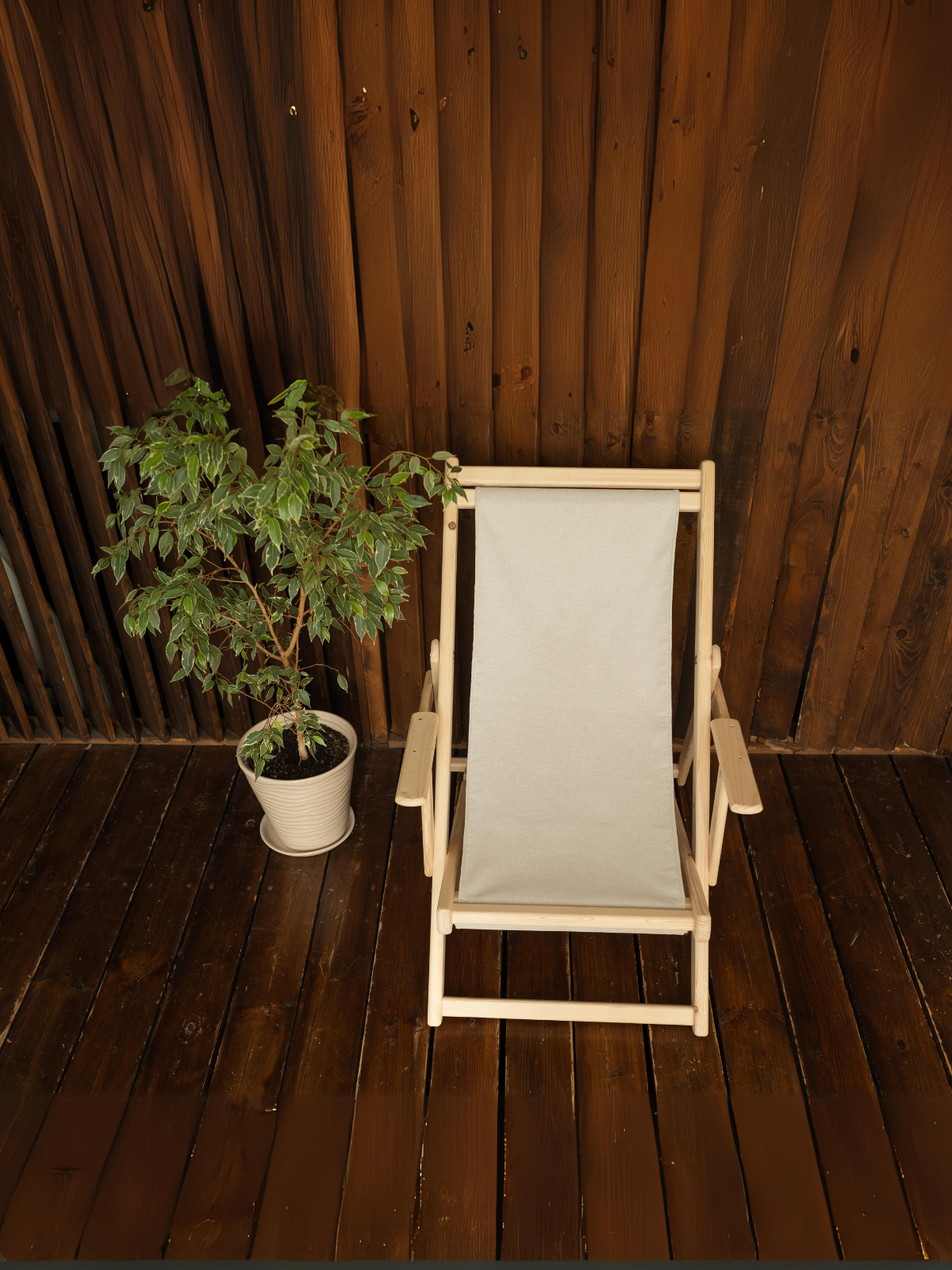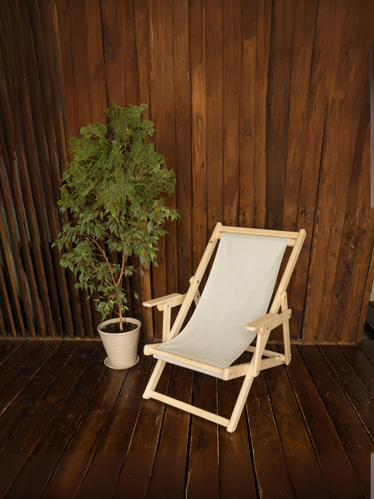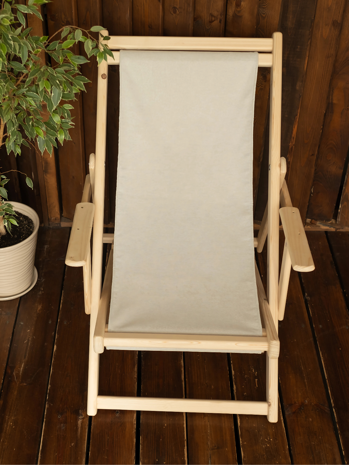Шезлонг с бежевой тканью и подлокотниками, деревянный, складной
