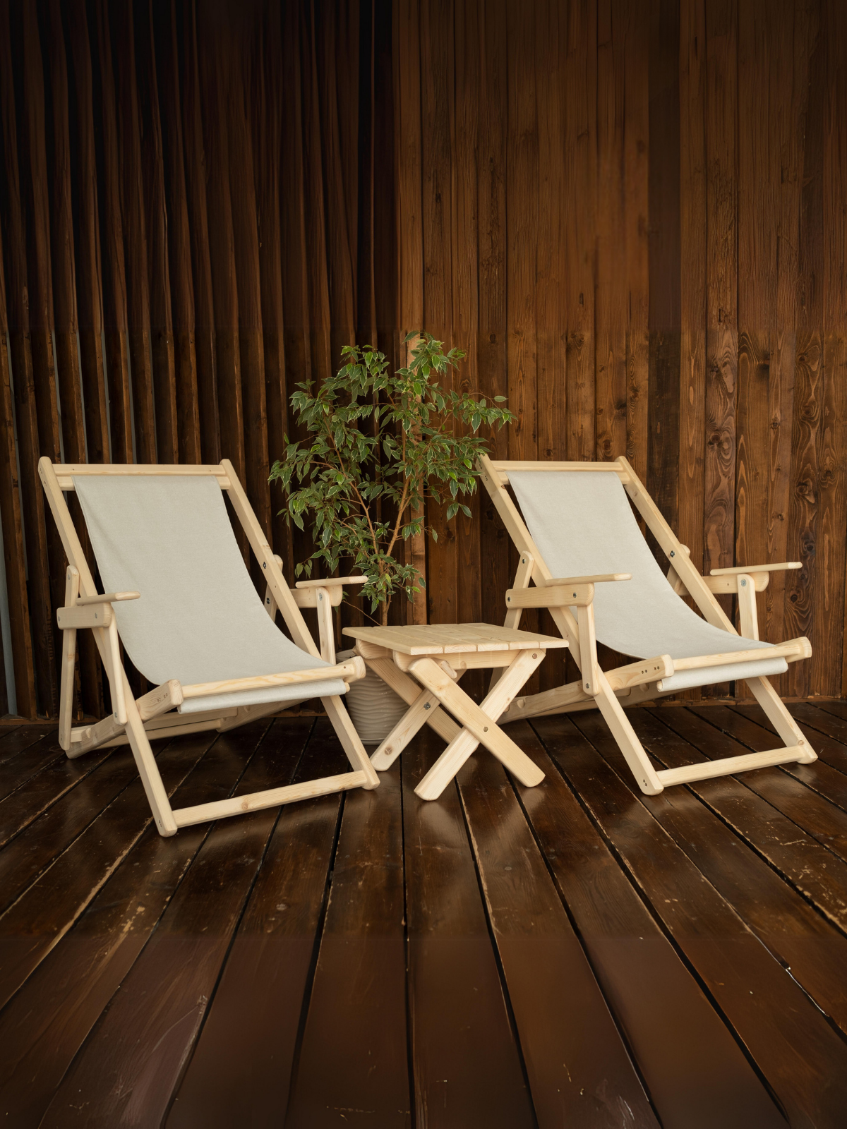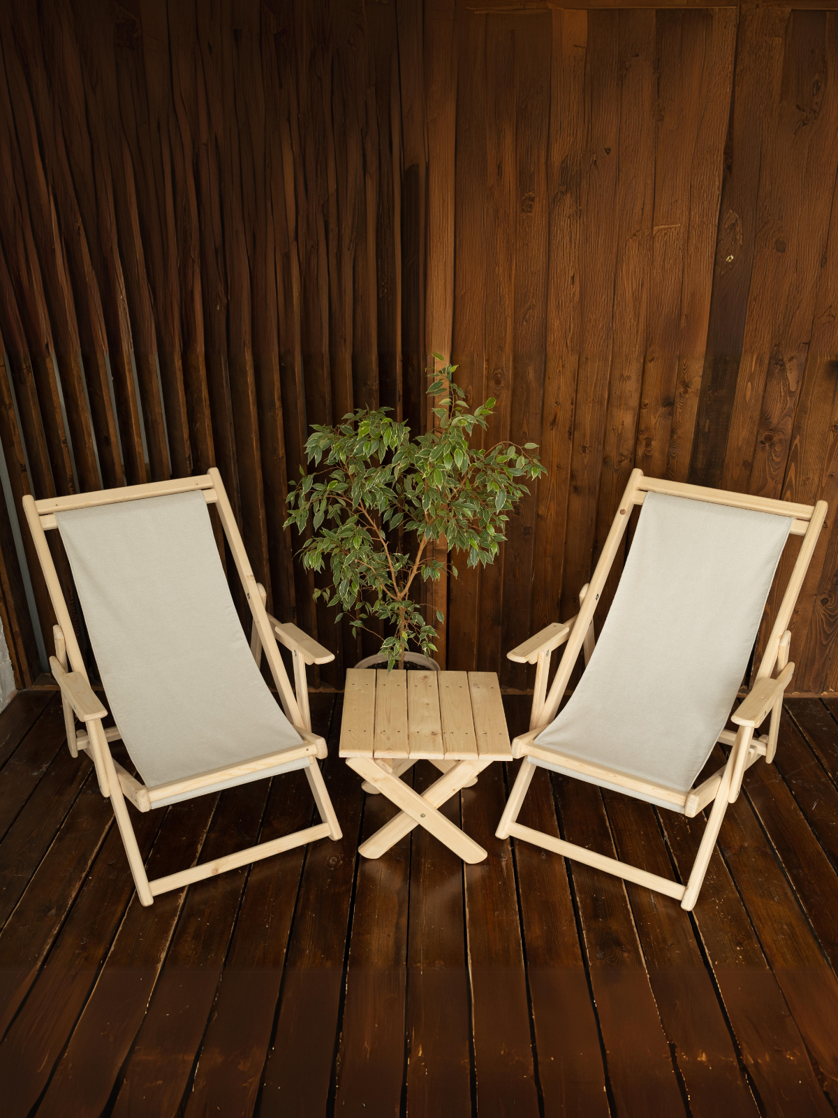 Шезлонги для дачи складные деревянные со столиком комплект, ткань бежевая