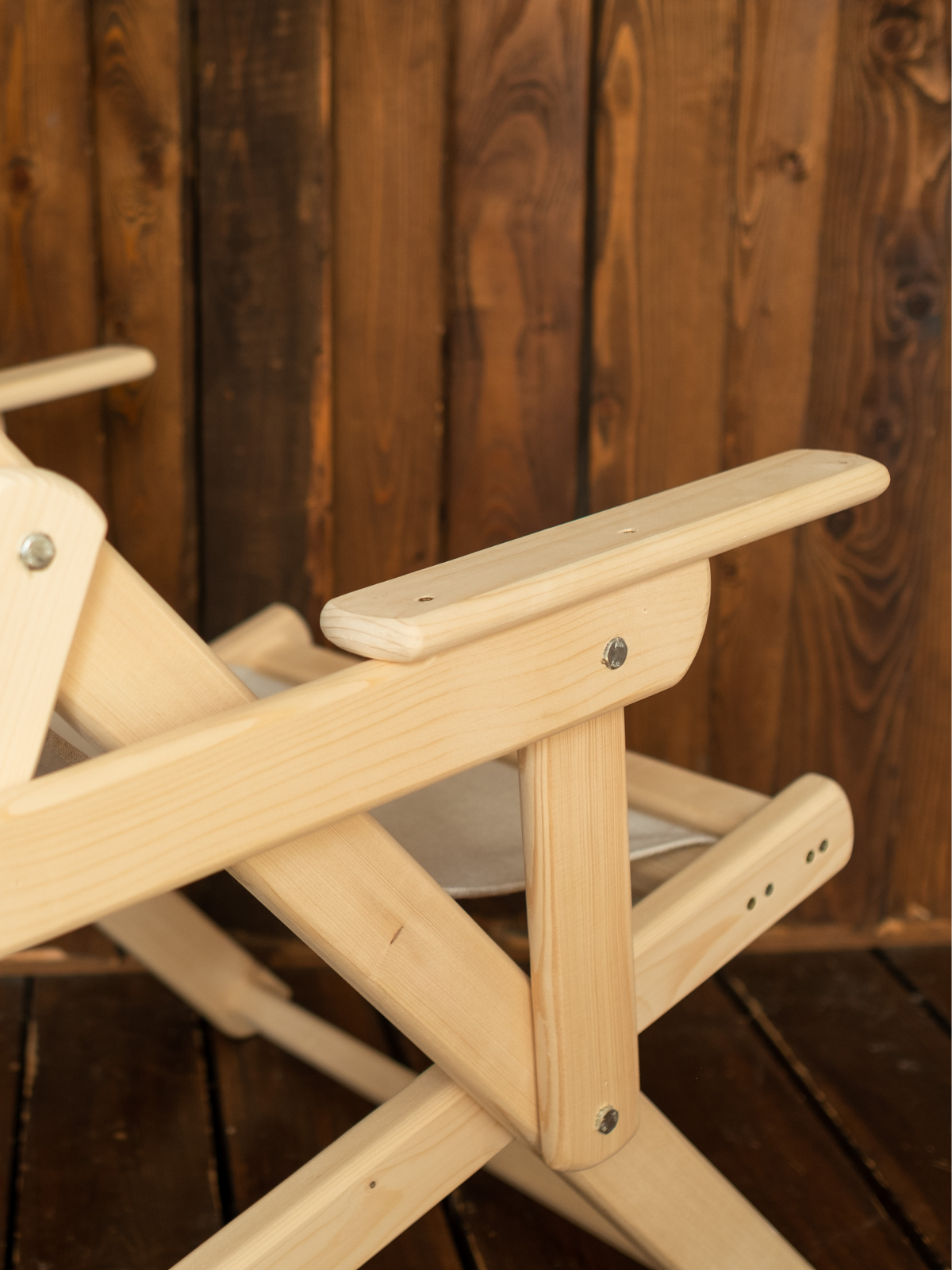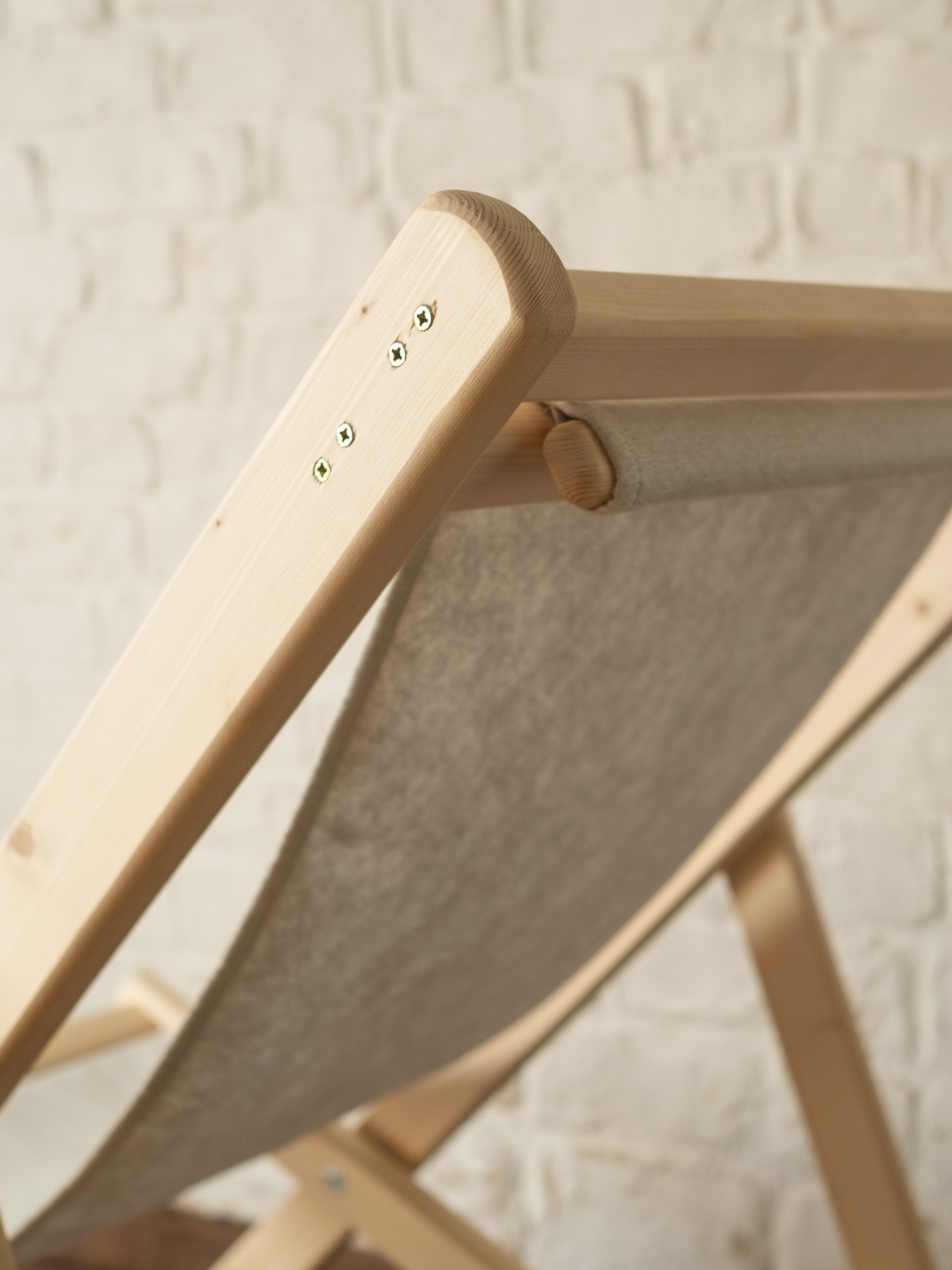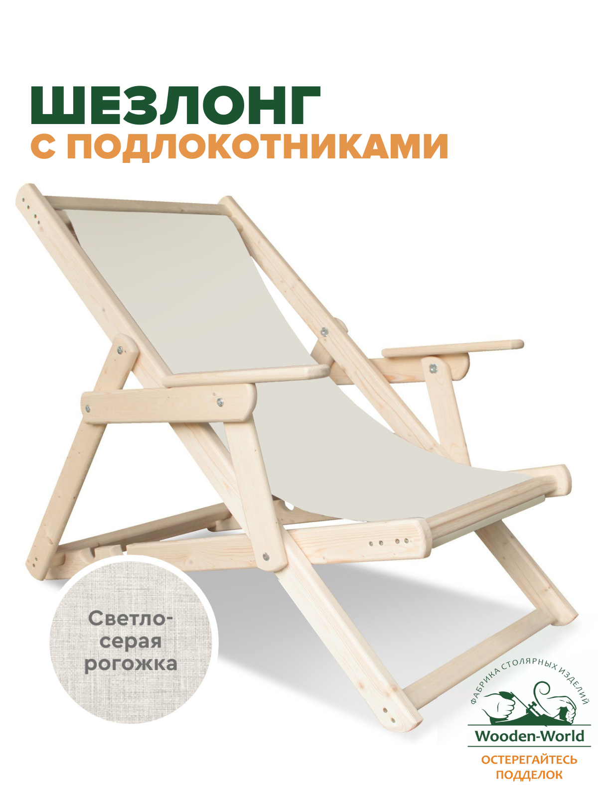 Шезлонг с светло-серой тканью и подлокотниками, деревянный, складной