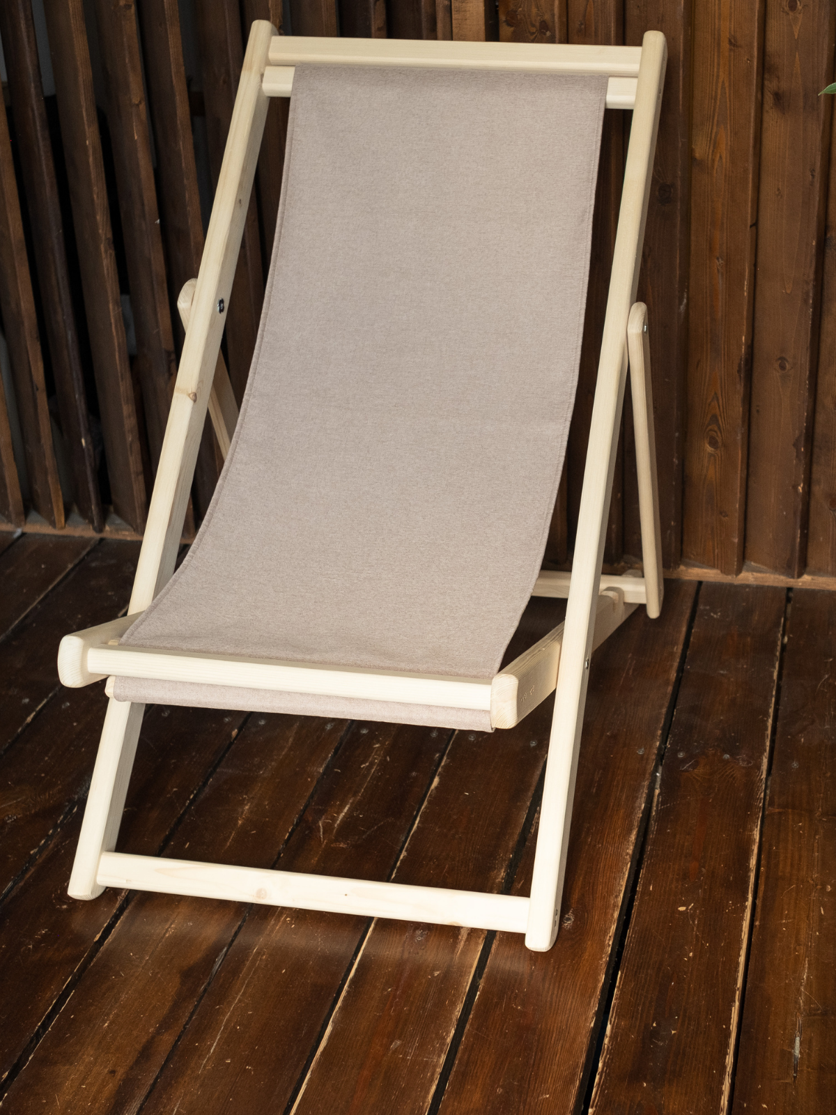 Шезлонг с светло-серой тканью, деревянный, складной