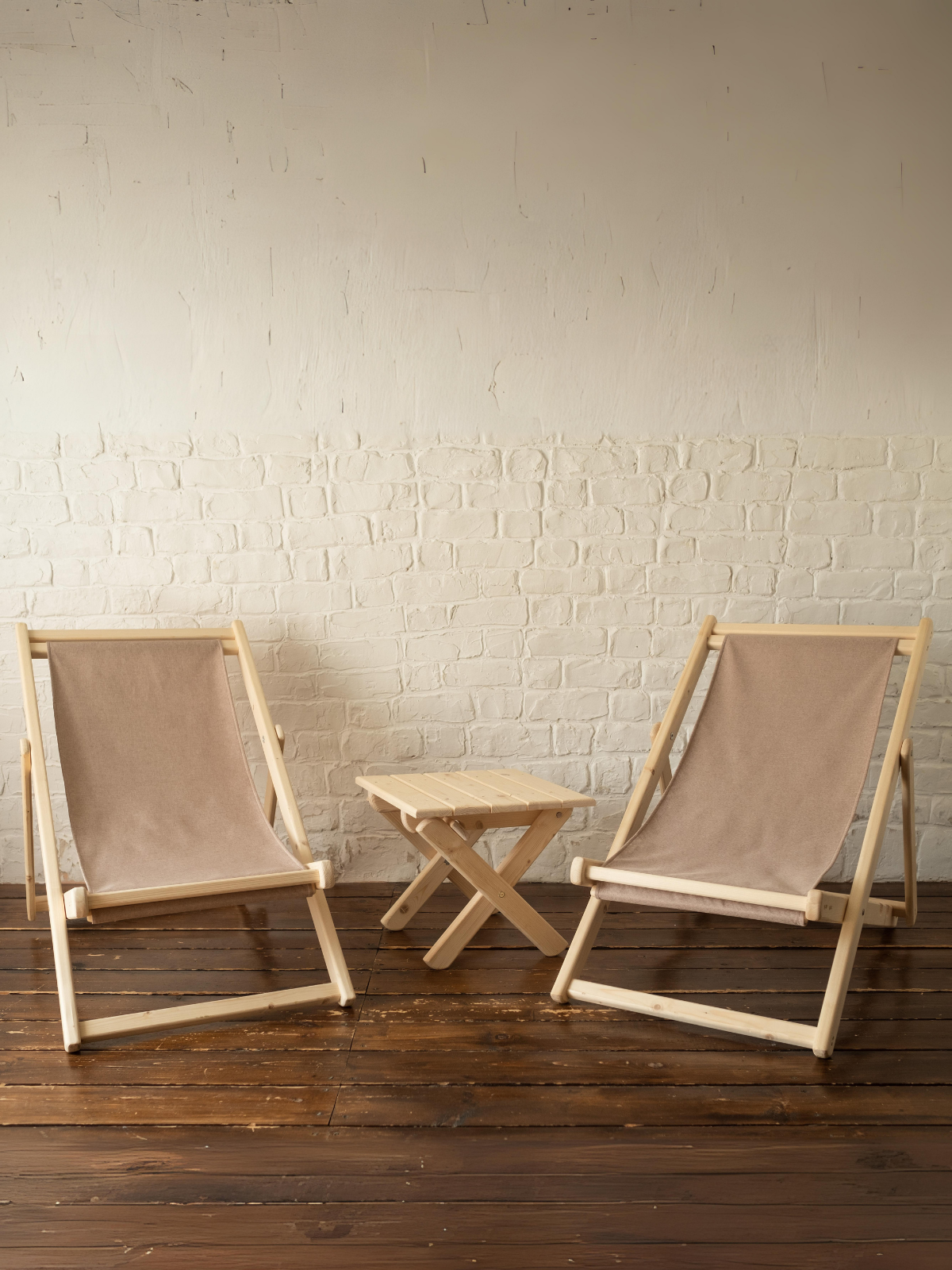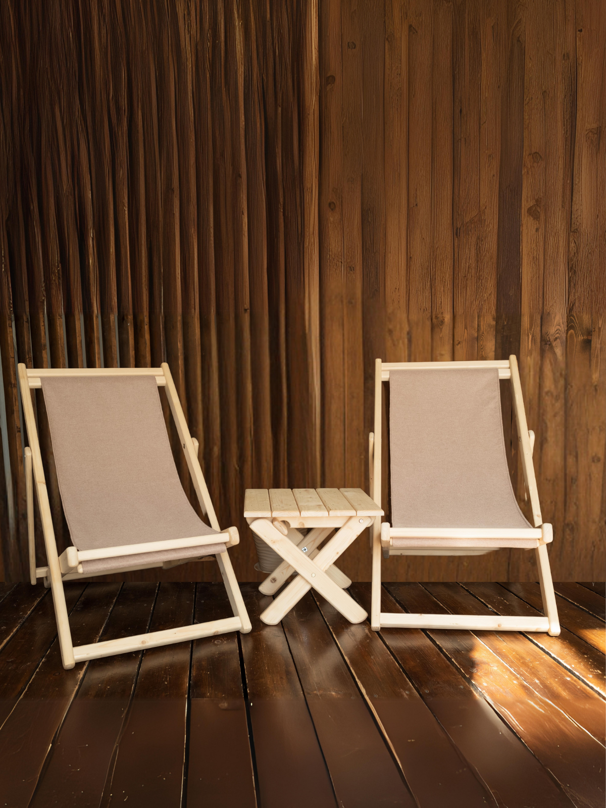 Купить Шезлонги для дачи складные деревянные со столиком комплект, ткань бежевая